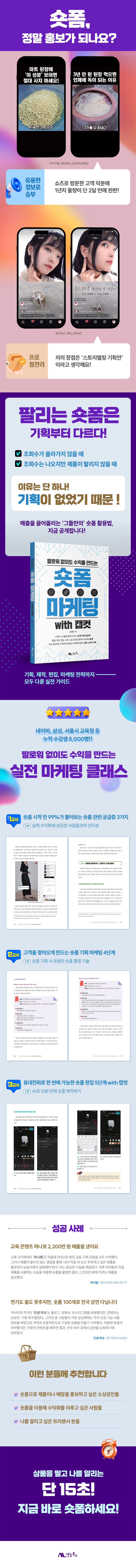 PART1숏폼시작전99%가물어보는숏폼관련궁금증3가지01숏폼이곧쇼츠인가요?릴스는뭐죠?__01-1숏폼은기존영상과무엇이다를까?__01-2릴스,쇼츠,틱톡-대표숏폼의차이점02숏폼이정말홍보가되나요?__02-1마케팅의가치를증명한숏폼__02-2매출을끌어올리는‘그들만의’숏폼활용법03일반인도숏폼으로돈을벌수있을까요?__03-1영상을열심히올렸다고주는보너스,광고수익+α__03-2실제수익화에성공한사람들과의인터뷰《에피소드1》나에게맞는숏폼주제는무엇일까?PART2고객을찾아오게만드는숏폼기획마케팅4단계01숏폼기획마케팅1단계:고객처럼생각하라__01-1고객은어떻게제품을찾을까?__01-2고객이매력을느끼는콘텐츠는무엇일까?__01-3고객은어떤기준으로물건을구매할까?__01-4고객이제품을구매할때필요한것은무엇일까?__01-5고객은제품사용경험을어떻게평가할까?02숏폼기획마케팅2단계:팔지말고베풀어라__02-1정보성숏폼기획1:내상품을구매해줄고객캐릭터설정하기__02-2정보성숏폼기획2:고객이실제로원하는정보찾기__02-3정보성숏폼기획3:고객의진짜고민을찾는핵심메시지찾기__02-4정보성숏폼기획4:카피문구를활용해콘텐츠제목만들기__02-5정보성숏폼기획5:화면속배우,부캐캐릭터만들기__02-6정보성숏폼기획6:짧고재미있게숏폼스러운대본만들기__02-7정보성숏폼기획7:하나의종이에정리하는스토리보드완성하기03숏폼기획마케팅3단계:친근하게다가가라__03-1나에게맞는숏폼챌린지알아보기__03-2댄서보다흥이넘치는숏폼댄스챌린지기획하기__03-3로봇연기여도이해되는패러디기획하기04숏폼기획마케팅4단계:고객을내편으로만들어라__04-1신뢰감을얻을수있는에피소드찾기__04-2마음을건드리는숏로그제목만들기__04-3감동을주는대본만들기__04-4촬영을미리생각하는스토리보드완성하기《에피소드2》숏폼기획시유용한숏폼촬영기술은?PART3휴대전화로한번에가능한숏폼편집5단계01숏폼편집1단계:캡컷시작하기__01-1캡컷설치하기__01-2캡컷홈화면살펴보기02숏폼편집2단계:영상,사진,이미지불러오기__02-1휴대전화에서동영상,사진불러오기__02-2라이브러리에서사진,영상,이미지불러오기__02-3편집화면살펴보기03숏폼편집3단계:필요한부분만남기는컷편집하기__03-1숏폼컷편집할때꼭알아야할것__03-2영상의앞,뒤장면을없애는컷편집__03-3영상의중간장면을없애는컷편집04숏폼편집4단계:가독성을높이는자막넣기__04-1숏폼에자막을넣을때꼭알아야할것__04-2기본자막넣기__04-3잘읽히는자막을만드는방법__04-4AI로자동자막만들기05숏폼편집5단계:집중력을높이는배경음악,효과음넣기__05-1배경음악,효과음을넣을때꼭알아야하는것__05-2캡컷에서배경음악넣기__05-3캡컷에서효과음넣기__05-4내휴대전화에서효과음과배경음악을불러오는방법《에피소드3》숏폼제작을도와주는사이트추천《부록》AI로10분만에숏폼제작하기