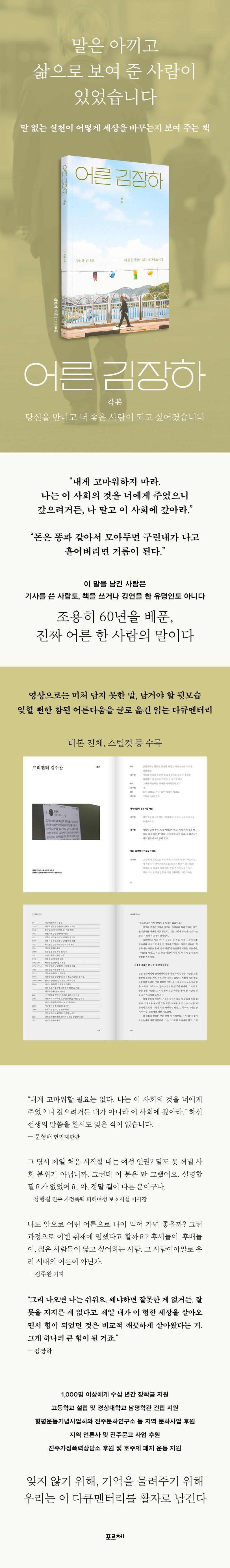 다큐멘터리 《어른 김장하》는 경남 진주의 한 약방에서 60년 넘게 이름 없이 살아온 김장하 선생의 삶을 따라간다. 장학, 기부, 인권, 언론, 문화까지 묵묵히 실천해 온 진정한 ‘어른’의 이야기는 방송 이후 점차 입소문을 타며 다시 조명되기 시작했다. 특히 문형배 헌법재판관이 가난한 농부의 장남으로 태어나 김장하 선생의 지원을 받아 공부했다는 사실이 알려지며 더욱 큰 반향을 일으켰다. 이 책은 《어른 김장하》 다큐멘터리 각본집으로 어른 김장하 선생의 울림이 있는 말씀을 담은 각본 전체와 미공개 스틸컷, 김장하 선생 연보, 비하인드 스토리를 담아 영상의 감동을 더욱 찬찬히 깊게 느낄 수 있다. “나에 대해 칭찬하지도 말고, 나무라지도 말고, 그대로 봐 주기만 했으면….” 바랐던 김장하 선생의 말씀을 따르기 위해 최대한 있는 그대로 여과 없이 펴냈다. 거짓과 미사여구 없이, 김장하 선생의 선행 목격담을 중심으로 이어지는 이야기는 가장 진실한 울림이 된다. 우리 시대의 진짜 어른, 김장하 선생의 말 없는 행함은 누군가에게는 감동으로 누군가에게는 일깨움으로 닿아 읽는 이로 하여금 좋은 사람이 되고 싶은 마음이 들게 한다. 이 책을 곁에 두고 읽는다면, “나는 어떤 어른이 되고 싶은가”라는 질문의 답을 찾을 수 있을 것이다. 기억은 금세 사라진다. 이 책은 어른의 삶을 활자로 담아 어른이 부재한 시대의 좋은 어른의 선한 영향력을 전한다. 김장하 선생은 등산할 때 그저 ‘사부작사부작 꼼지락꼼지락’ 가면 된다고 말한다. 사부작사부작, 한평생 거름을 뿌리며 살아온 그를 따라 생의 희망을 짓는다.