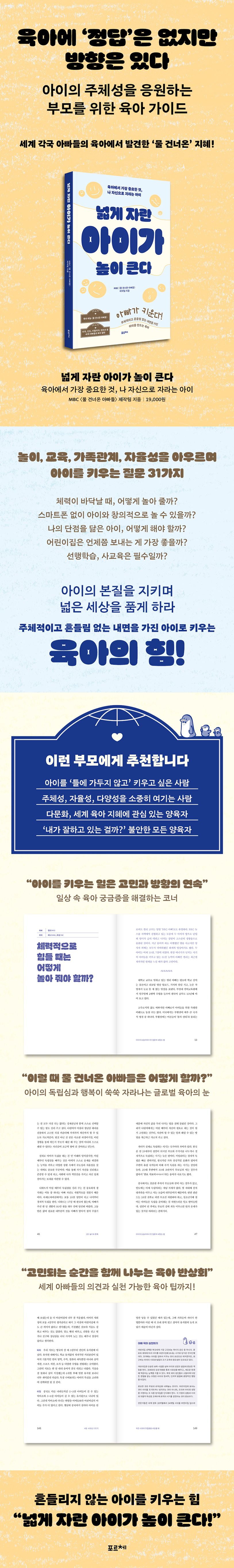 아이를 주체적인 사람으로 키우고 싶다면, 부모 역시 고민을 두려워하지 말아야 한다. 이 책은 한국에서 아이를 양육하는 외국인 아빠들이 모여 솔직한 육아 경험을 나눈 MBC 프로그램 〈물 건너온 아빠들〉을 바탕으로 만들어졌다. 이 프로그램에 출연한 인도, 미국, 이탈리아, 남아공, 덴마크 등 다양한 국적의 아빠들은 한국이라는 자신이 자리 오지 않은 환경에서 아이를 키우며 시행착오를 겪는다. 놀이, 교육, 문화 차이, 사회성, 가족 관계, 삶의 방향성을 아우르는 31가지 질문을 통해 ‘아이를 키운다는 것’의 본질을 만나 보자. 어떻게 하면 아이가 스스로 생각하고 주체적으로 살아가는 힘을 키울 수 있을까? 학업, 놀이, 자율성 등 육아의 다양한 관점에서 흔들리지 않는 중심을 잡으려면 어떻게 해야 할까? 이 책에 등장한 다양한 육아 철학을 통해 부모 스스로도 시야를 넓히고, 아이가 ‘나 자신으로 자라는’ 육아 팁을 얻을 수 있을 것이다. 아이의 자율성과 성장을 진심으로 고민하는 부모, 완벽한 부모가 되지 않아도 괜찮다는 위로가 필요한 부모, 아이와 함께 성장하고 싶은 모든 부모에게 전하는 이 책의 메시지이다.