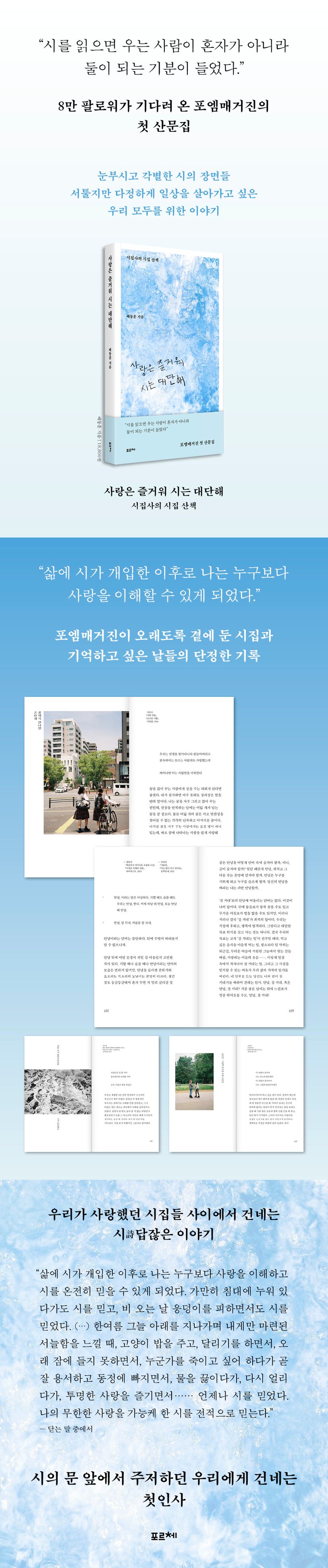 시가 낯설고 어렵게 느껴지는 시대에 부지런히 시를 알려 온 포엠매거진 배동훈 대표의 첫 산문집이 출간됐다. 이 책은 시를 있는 그대로 바라보며 떠오른 감정과 장면 들을 기꺼이 끌어안고, 오래도록 기억하고 싶은 마음을 고이 간직하는 방법을 알려 준다. 연애와 이별, 친구의 결혼식, 혼자 남겨진 하루, 단순하지만 복잡한 감정과 일상의 순간들이 시 한 편의 여운처럼 다가온다. 최승자, 이병률, 박준 등 오랜 시간 사랑받아 온 시인의 작품부터 고선경, 황인찬, 김연덕 등 지금 이 시대를 이끄는 젊은 시인의 작품까지 함께 수록되어 세대를 넘나드는 시의 매력을 보여 준다. 순간의 장면을 놓치지 않는 기민한 감각과 시를 향한 애정을 가감 없이 풀어낸 이 책은 시를 곁에 두고 살아가는 마음의 기록이다. 이 책은 시를 어떻게 읽어야 한다고 말하지 않는다. 대신 책에는 포엠매거진이 직접 고른 시 47편 속 구절과 그 시집을 읽던 시기의 감정, 반복해 떠오른 문장들, 자신을 마주한 웅숭깊은 이야기가 짧지만 진심을 담은 언어로 기록되었다. “시를 읽으면 우는 사람이 혼자가 아니라 둘이 되는 기분이 들었다.” 이 책은 그런 감정을 기억하는 사람들에게, 혹은 아직 그런 순간을 만나지 못한 사람들에게 시가 줄 수 있는 가장 깊은 사랑과 슬픔의 언어를 건넨다.