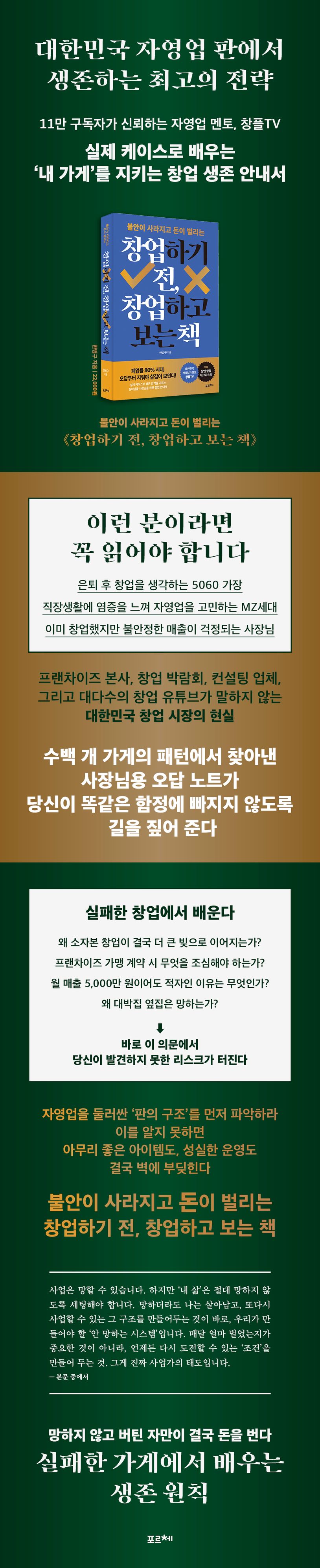 “내 가게 차리면, 회사보다 낫지 않을까?”, 많은 이들이 창업으로 ‘제2의 인생’을 꿈꾼다. 하지만 통계는 냉혹하다. 국내 자영업자 10명 중 8명은 오래지 않아 문을 닫는다. 누군가에게는 ‘꿈’이었고, 누군가에게는 노년을 위한 ‘퇴직금 투자’였으며, 또 누군가에게는 ‘생존’이었던 창업이 어째서 실패하는 것일까. 이 책은 수많은 가게가 왜 망할 수밖에 없었는지를 예리하게 분석하고, 망하지 않으려면 성공하려면 무엇을 준비해야 하는지 하나하나 짚어준다. 저자는 유튜브 채널 ‘창플TV’와 네이버 카페 ‘창플’을 통해 수많은 초보 사장들의 실패 사례를 수집하고, 분석하며 그 안에 숨어 있는 망하는 가게의 공통 패턴을 알려왔다. 프랜차이즈 창업, 창업 박람회, ‘창업 컨설턴트’의 감언이설, 대출 유도, 본사의 구조적 수익 시스템까지. 겉으로는 달콤해 보이는 제안이 사실은 초보 창업자의 무지를 이용해 이득을 챙기는 구조임을 이 책을 통해 폭로한다. 기형적인 대한민국 자영업 시장의 구조 속에서 반복되는 ‘오답’을 찾고 분석해 그 속에서 절대 망하지 않는 가게가 되는 법을 정리했다. 특히 퇴직금을 쏟아부은 창업일수록 열정, 진심, 성실함만으로는 버티기 어렵다. 창업 시장의 판도를 읽는 법이 중요한 이유다. 누군가가 “요즘 핫한 아이템이에요”, “본사에서 다 도와줘요”라고 할 때, 무엇을 의심해야 하는지. 매출이 조금씩 오를 때 어떤 구조를 점검해야 하는지 성공하는 창업을 위한 A to Z를 하나씩 알려준다.