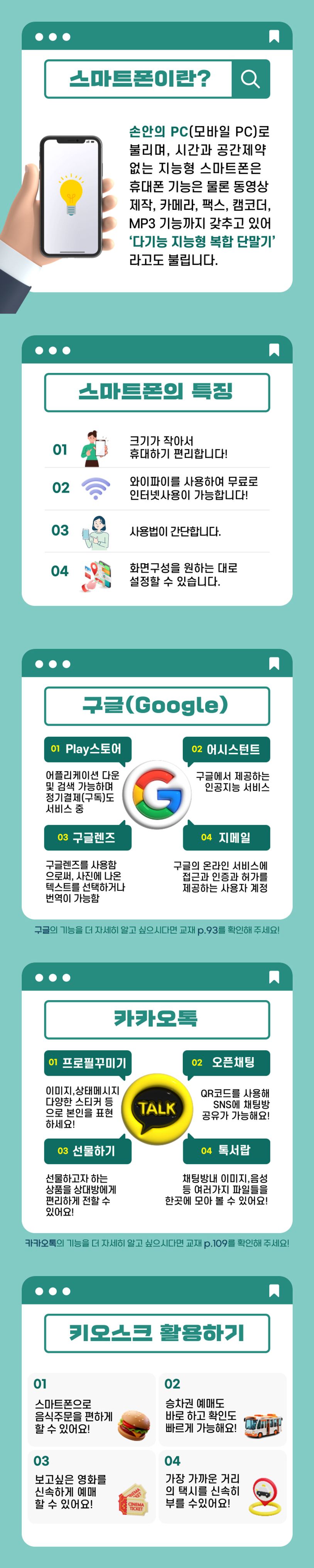 이 책은 대한민국 액티브 시니어ㆍ실버 세대를 위해 제작된 스마트폰 활용 지침서입니다. ㈜디지털콘텐츠그룹은 16년간 시니어들을 대상으로 스마트폰 교육을 진행해오면서, 그들이 가장 필요로 하는 기능들을 파악하여 이 책에 반영했습니다.