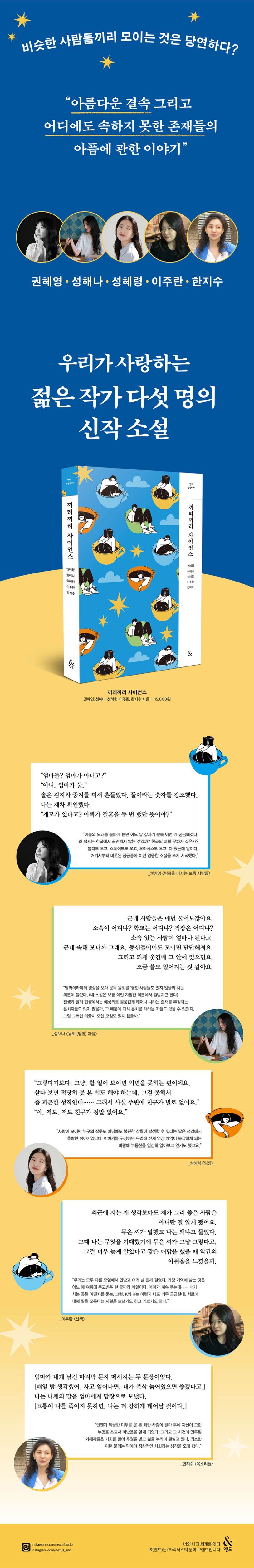 다섯 명의 작가가 참여한 앤솔러지 『끼리끼리 사이언스』에서는 각기 다른 작품마다 다양한 상황 속에 던져진 주인공과 등장인물들이 자기의 정체성을 찾아가는 과정을 담고 있다. 아이러니한 삶 속에서 마주한 주인공의 운명을 통해 생의 진실을 돌아보게 하는 작품에서부터 비정한 현대 사회의 이면을 칼날 같은 시선으로 응시하다가도 따뜻한 손을 내밀어 안아주고 상처를 어루만져주는 이야기, 한없이 일상적이지만 프루스트적인 문학적 깊이가 느껴지는 단편, 그리고 블랙코미디 같은 서사를 읽다 보면, 독자를 순식간에 구경꾼에서 사건의 한복판에 선 목격자로 강렬하게 끌어들이는 소설에 이르기까지 풍부하고 매력 넘치는 소설들로 가득하다.