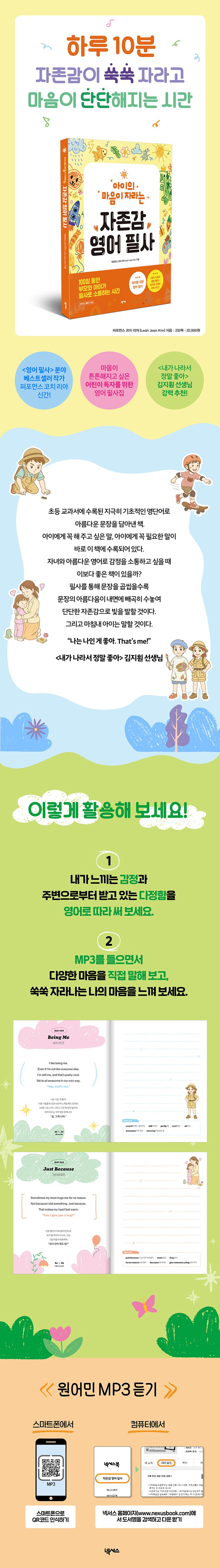 내 마음은 나의 것이에요. 내가 어떤 감정을 가지고 있고, 주변으로부터 어떤 사랑을 받고 있는지 영어로 따라 써 보세요. 그리고 MP3를 들으면서 다양한 마음을 직접 말해 보는 연습을 해 보세요. 특히 마지막 문장은 큰 소리로 외치면서, 쑥쑥 자라나는 나의 마음을 느껴 보세요.