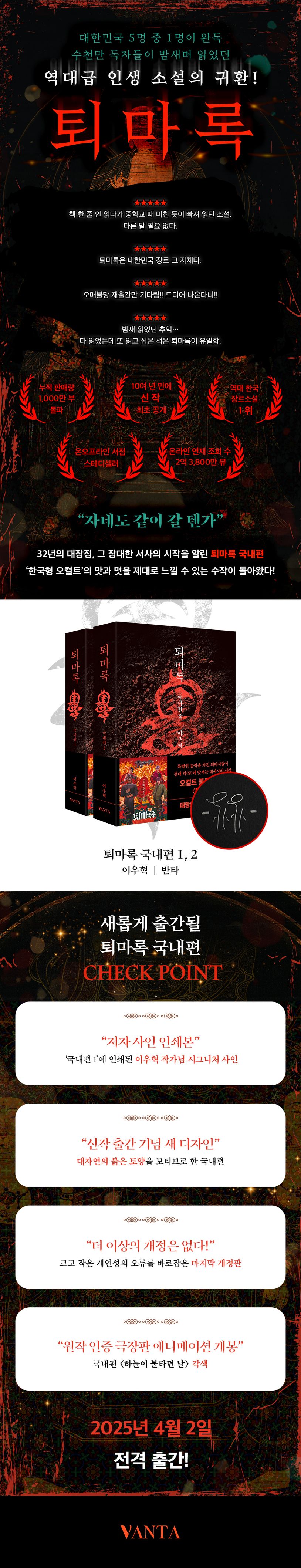 2025년2월21일개봉한애니메이션영화〈퇴마록〉의상승세에힘입어,영화의원작스토리가된《퇴마록국내편》전2권이오는4월오팬하우스에서선출간된다.85분으로압축된애니메이션에서는미처확인하기어려웠던인물들의장대한서사와과거히스토리를다시금찾아볼수있어애니메이션과비교해서보는재미는물론,원작소설만이주는오리지널리티의감동을더욱크게느낄수있다.거기에더해구판해설집이아쉽지않을정도로상세한설명을각주로달았으며,크고작은개연성의오류를한번더잡아낸완성형판본으로독자들의소장욕구를자극할것이다.