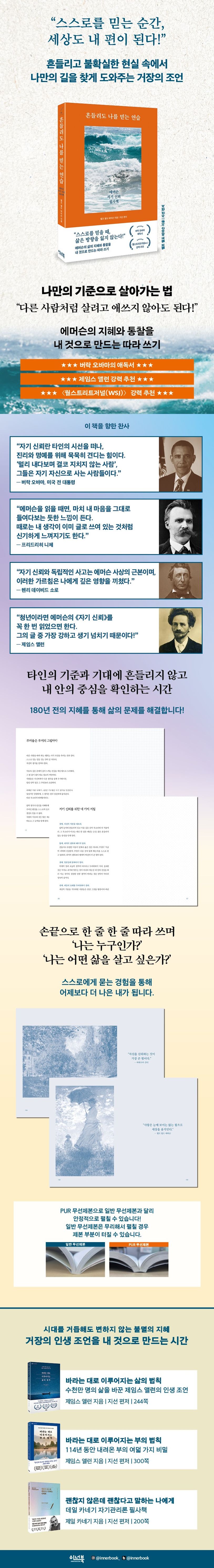이 책은 단순한 필사책이 아니라, 에머슨의 사상을 지선만의 따뜻하고 간결한 문체로 전달한다. 《흔들려도 나를 믿는 연습》을 한 줄 한 줄 따라 쓰다 보면 자신과 만나게 될 것이다. 그동안 잊고 있던 마음의 소리를 통해, 타인의 기준이 아닌 나만의 기준으로 세상을 살아가는 법을 알게 될 것이다.