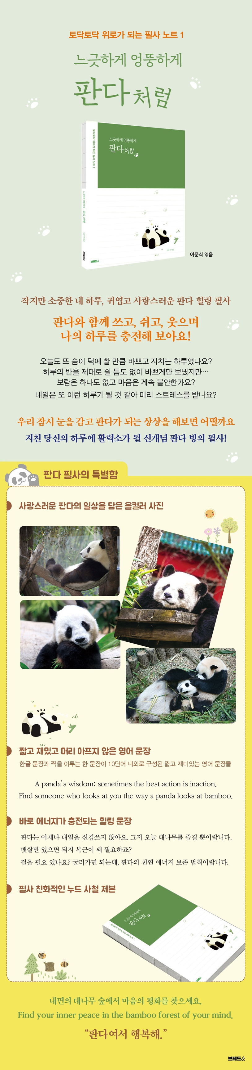 이 책은 온전히 판다의 입장에서 들려주는 ‘판다 빙의 필사’랍니다. 판다는 어떻게 항상 여유 있을 수 있는지, 왜 항상 걱정 없이 잠들 수 있으며, 왜 항상 사람들에게 웃음을 줄 수 있는지에 대한 내용들을 담았죠. 판다는 판다고 사람은 사람인데 판다의 삶을 안다고 사람이 더 행복하거나 여유로워지는 건 아니지 않냐구요? 이 책을 펼치면 생각이 달라질 거예요.