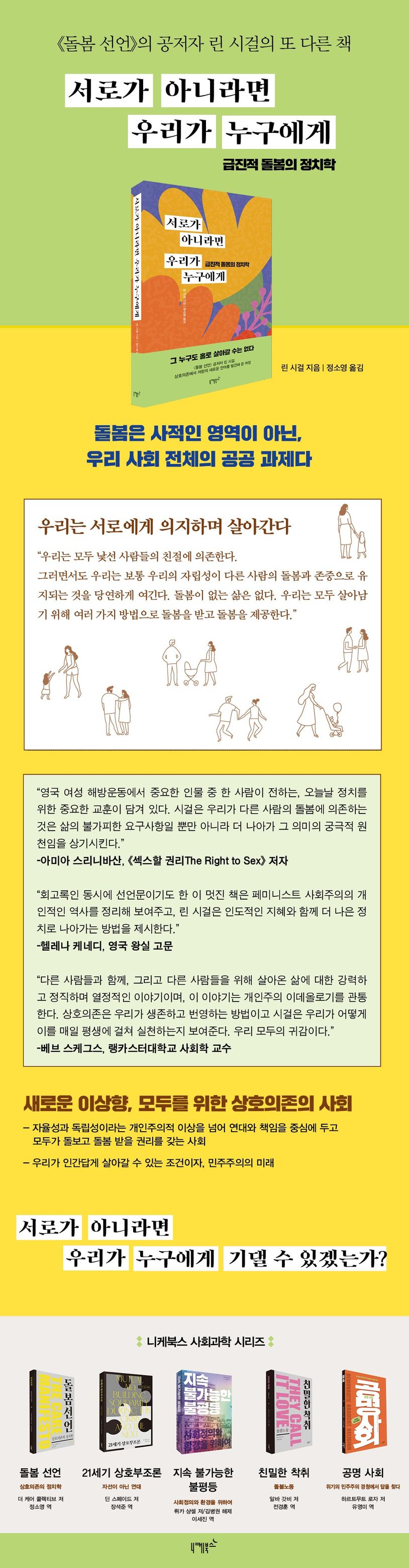 린시걸은《서로가아니라면우리가누구에게》에서돌봄은더이상가족이나개인에게만맡겨져야할‘사적인영역’이아니라,사회전체가함께책임져야할공공의과제라고주장한다.지금까지의사회는돌봄을주로여성에게맡겨왔으며,돌봄을가정내부의비가시적인노동으로취급해왔다.이는여성의삶과경력에불균형한부담을주었고,돌봄노동의가치와중요성은사회적·경제적으로제대로평가받지못했다.하지만시걸은돌봄이단지유아나노인을위한한시적지원이아니라,인간생애전반에걸쳐필수적인행위이며,우리사회를지탱하는핵심적기반임을지적한다.누구나아플수있고,늙고,혼자가될수있기에돌봄은‘일부사람의문제가아닌모두의문제’다.시걸은돌봄이지속가능하려면공공영역에서적극적으로제도화되어야하며,보편적복지,의료시스템,돌봄인프라구축등을통해집단적책임으로다시조직되어야한다고주장한다.이는단지윤리적요구를넘어서,사회정의와민주주의실현의핵심조건이다.돌봄이공적자원으로전환될때,비로소모든사람이존엄하고평등한삶을누릴수있으며,돌봄을받는이와제공하는이모두가존중받는사회로나아갈수있다.
