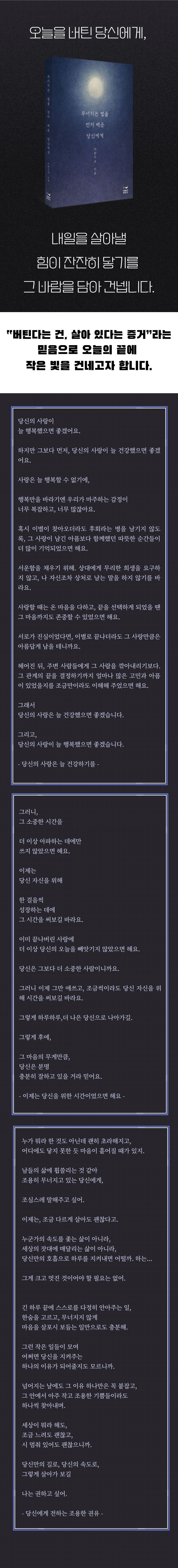 별이 뜨지 않는 밤에도 새벽은 찾아오듯, 이 책의 문장들이 오늘을 견디는 당신에게 작은 빛이 되기를 바랍니다.