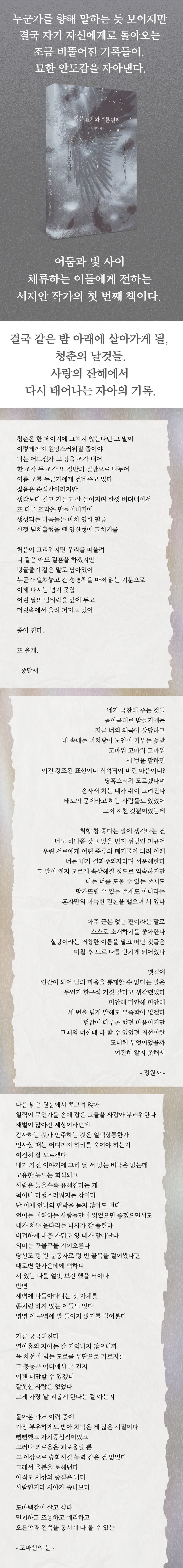 어둠과 빛 사이 체류하는 이들에게 전하는 그녀의 첫 번째 작품.