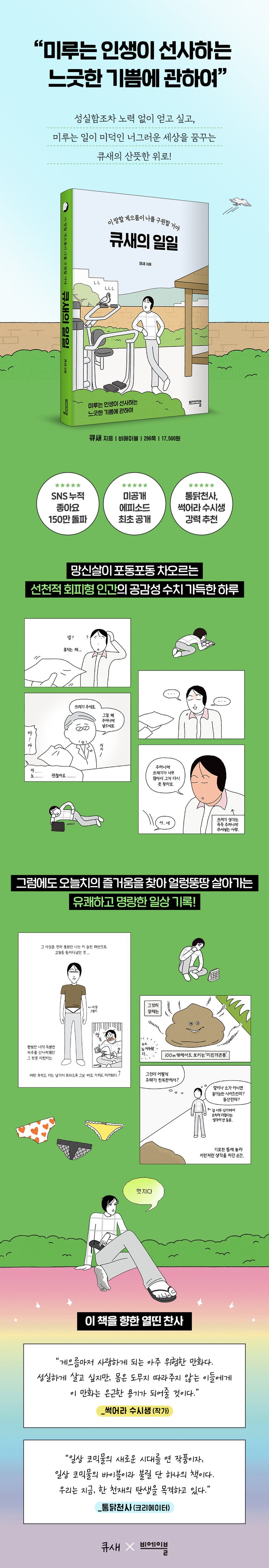 ‘성실함조차 노력 없이 얻을 수 없을까?!’ SNS 누적 2,500만 뷰를 돌파하며 2030 독자들의 뜨거운 반응을 이끌어낸 ‘큐새’ 작가의 첫 그림 에세이. 들끓는 욕망과 무기력한 일상 사이의 괴리감을 묘사하며 무릎을 치게 만드는 일상 블랙코미디를 책으로 만난다. 누워 있어도 자꾸만 누워 있고 싶은 지독한 무기력과 매분 매초 싸우고, 책임지는 일은 영원히 미루고 싶은 만성적 회피형 인간이 ‘우당탕탕’ 살아가는 하루하루를 담았다.