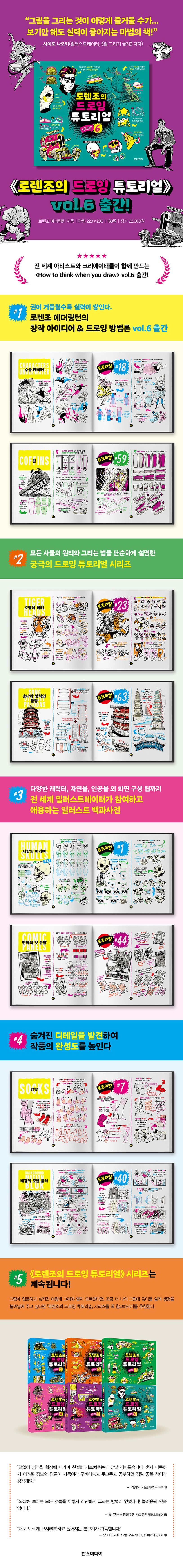 “그림을그리는것이이렇게즐거울수가...보기만해도실력이좋아지는마법의책!”_사이토나오키(일러스트레이터,《잘그리기금지》저자)“저도모르게모사(模寫)하고싶어지는본보기가가득합니다.”_요시다세이지(일러스트레이터,《이야기의집》저자)“복잡해보이는모든것들을이렇게간단하게그리는방법이있었다니!놀라움의연속입니다.”_효고노스케(포켓몬카드공인일러스트레이터)“끝없이영역을확장해나가며친절히가르쳐주는데정말경이롭습니다.혼자터득하기어려운정보와팁들이가득이라구비해놓고두고두고공부하면정말좋은책이라생각해요!”_익명의자료계(트위터)모든사물의원리와그리는법을철처히단순하게설명한궁극의Tips&자료집백과사전처럼수많은드로잉튜토리얼을다루는이책의특징은,“아무리복잡한모티프라도,철저히단순화해생각하고그리는방법을해설한다”는것입니다.즉그리는방법의원점(본질)을해설하는책입니다.그리는방법의기본을앎으로써,그릴수있는일러스트의레퍼토리가증가하는것은물론,거기로부터의파생(베리에이션)이나독자성(오리지널리티)을강화할수있습니다.숨겨진디테일을발견하여작품의완성도를높인다이시리즈는디테일의가치를찾아낼수있는정신에서탄생했습니다.아티스트인당신의능력을높여줄아이디어와방법을모든페이지에서찾을수있습니다.하나의작은디테일을바꾸는것만으로도작품의완성도가높아지는걸직접따라그려보면서확인하세요.다양한캐릭터,자연물,세계관구축을위한다양한오브제와화면구성팁까지전세계일러스트레이터가참여하고애용하는일러스트백과사전이번vol.6에서는사람의머리뼈,흉곽,앞톱니근등캐릭터의각부위를그리는방법부터호랑이머리,해파리,통나무,이끼,설경의색등자연의세계,서부개척시대건물,텐트,관등의인공물그리고정글의구도,만화컷분할등레이아웃&구도.이렇게7개다양한분야의100여가지주제를다루며이를깊이있게그려내는데도움이되는그림기법을다양한예시와함께담고있습니다.권이거듭될수록더다양하고깊이있는소재와디테일을다루고있는《로렌조의드로잉튜토리얼》시리즈는앞으로도계속출간예정입니다.