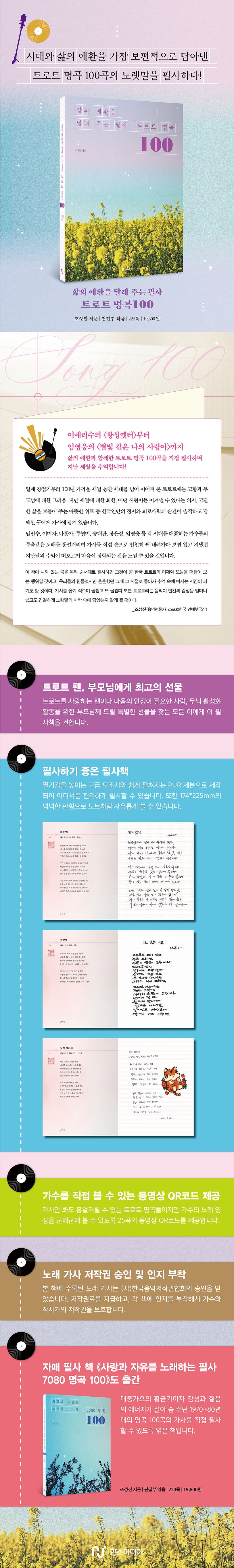 《삶의 애환을 달래 주는 필사 트로트 명곡 100》은 지난 100년 가까운 세월 동안 우리 대중음악의 근간을 이루며 면면히 이어져 온 트로트 대표 명곡 100곡의 가사를 직접 필사할 수 있도록 엮은 책이다. 1920년대 이애리수의 〈황성옛터〉부터 2020년대 임영웅의 〈별빛 같은 나의 사랑아〉까지 우리 트로트를 대표하는 노래 100곡의 가사를 연도별로 정리하여 한 권에 담았다. 트로트를 사랑하는 팬뿐만 아니라 마음의 안정이 필요한 사람, 부모님께 드릴 특별한 선물을 찾는 모든 이에게 이 필사책을 추천한다.