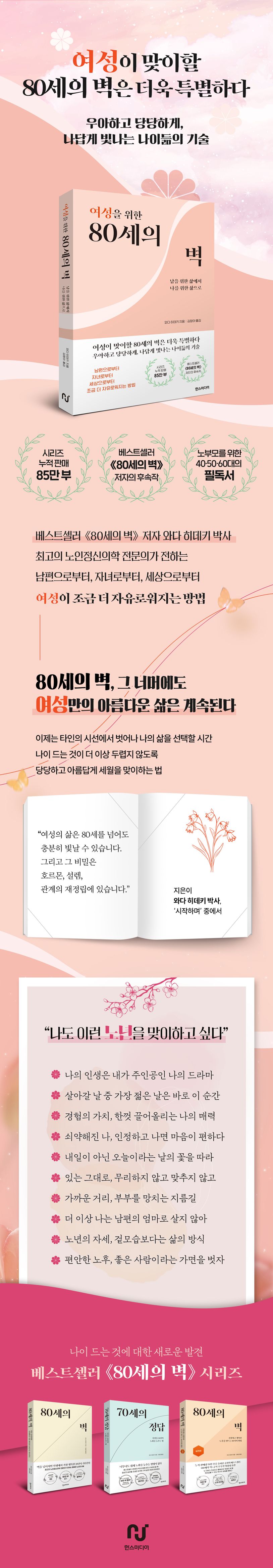 시리즈 누적 판매 85만 부를 돌파한 베스트셀러 《80세의 벽》의 저자 와다 히데키가 이번에는 여성만을 위한 노후 지침서로 돌아왔다. 신간 《여성을 위한 80세의 벽》은 이전보다 더 진화하고 더욱 깊이 있게 ‘80세 이후의 삶이 어떻게 달라질 수 있는지’를 생생한 사례와 의학적 근거로 풀어낸다. 특히 고령 여성들이 건강과 활력을 유지하며, 사회와 관계 속에서 자기다움을 지키는 법을 알려준다. 저자는 “여성의 삶은 80세를 넘어도 충분히 빛날 수 있다. 그리고 그 비밀은 호르몬, 설렘, 관계의 재정립에 있다”라고 강조하고 구체적인 실천법까지 소개한다. 또한 저자는 이 책을 통해 “행복한 노후는 돈이나 지위가 아니라 ‘나답게 살아가는 것’에서 비롯된다”고 강조한다. 그는 고령 여성들이 자신만의 삶의 철학과 생활방식을 구축하면 나이와 상관없이 충분히 매력적이고 건강한 삶을 살 수 있다고 말한다.