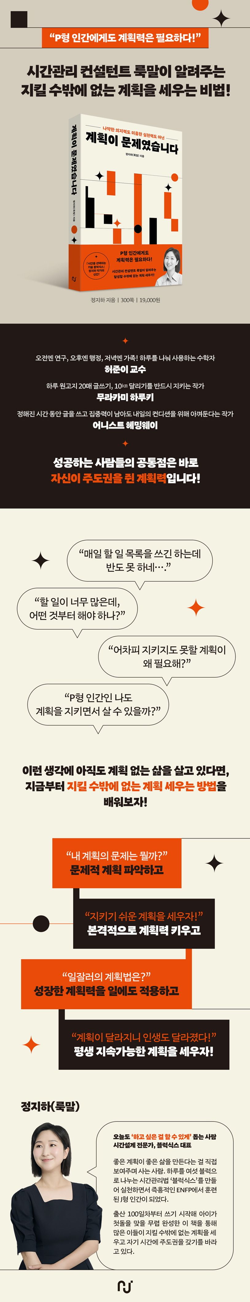 요즘 세상에 한 가지 역할만 맡는 사람은 없다. 가정에서, 직장에서, 사회에서 각자 여러 개의 역할을 부여받는 우리는 한정된 시간 안에 주어진 일을 해내야 한다. 이를테면 다음 주 월요일에 아이 학부모 상담을 가야 하는데 그 다음 날에는 중요한 프로젝트 발표가 있고, 그러면서 사이에 가족 여행 계획도 세워야 하는 식이다. 그러나 시간은 너무나 한정적이다. 밥을 먹고 잠을 자고, 회사에서 일하는 시간을 빼면 우리가 자유롭게 운용할 수 있는 시간은 하루에 몇 시간 되지 않는다. 복잡한 일정을 어떻게 정리하고 계획을 세워야 할까. 우리가 늘 어려워하는 주제다. 4년 전 『시간을 선택하는 기술, 블럭식스』라는 책으로도 독자들을 만난 정지하(룩말) 작가는 이번 신간『계획이 문제였습니다』에서 그런 우리에게 ‘계획력’을 키우는 법을 소개한다. ‘계획은 세워봤자 매번 실패하는걸’ ‘할 일이 너무 많아서 무엇부터 해야 좋을지 모르겠어’ 이런 생각을 하고 있는 사람이라면 이 책은 하나의 해답을 되어 줄 수 있을 것이다.