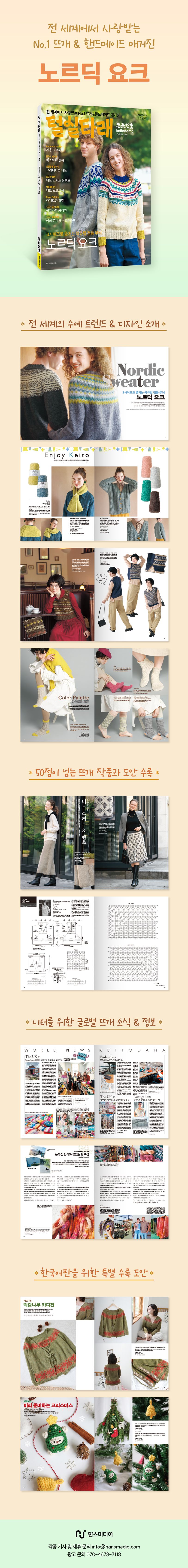 〈털실타래〉는 현재 전 세계에서 큰 사랑을 받고 있는 최고의 뜨개 & 핸드메이드 잡지입니다. 뜨개 전문기업 일본보그사에서 매 계절(봄, 여름, 가을, 겨울)마다 발간해온 수예 전문지로, 한국에서는 2022년 가을호를 시작으로 꾸준히 발행하고 있습니다. 이번 호의 주제는 ‘노르딕 요크’로 북유럽 전통 무늬를 다양한 색과 디자인으로 즐길 수 있는 니트들을 담았습니다. 이와 더불어 코바늘로 만드는 가을 크로셰 웨어, 편하고 귀여운 베스트 등 다채로운 옷과 소품을 소개합니다. 이외에도 한국어판만의 특별한 작품과 도안을 담았습니다.