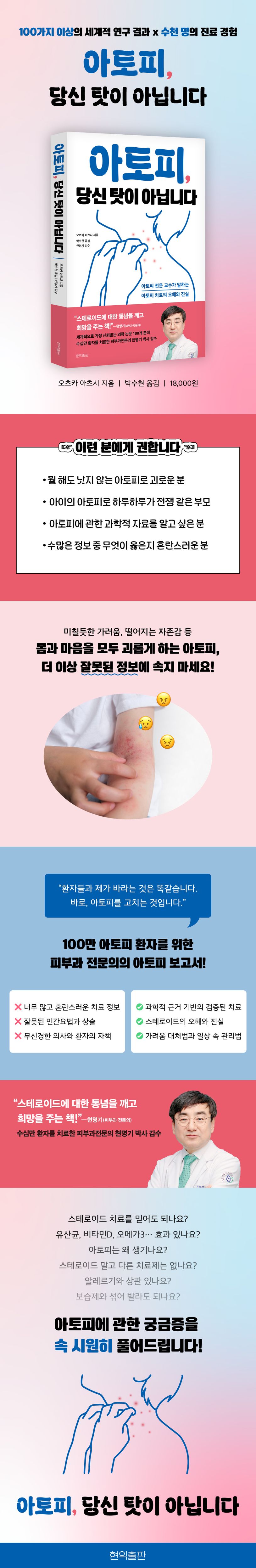 국내 아토피 환자가 100만 명을 넘어섰다. 아토피 환자가 겪는 고통은 미칠듯한 가려움 그 이상이다. 아토피는 수면, 인간관계, 자존감, 심지어 가족의 삶까지 흔드는 질환이기 때문이다. 수많은 아토피 환자들이 절실한 마음으로 잘못된 정보와 상술에 휘둘리고 치료 실패를 자책하며 고통받는 현실, 이 책은 그 악순환을 끊기 위해 쓰였다.