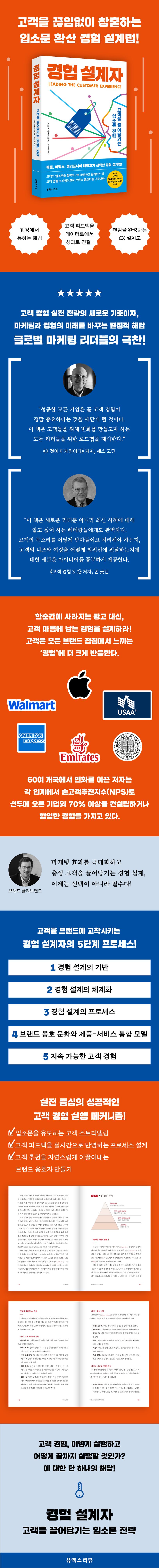 『경험 설계자: 고객을 끌어당기는 입소문 전략』은 30년 글로벌 컨설팅 경험과 고객 서비스 분야의 표준을 만들어 온 저자가 집대성한 ‘실전 경험 설계 매뉴얼’이다. 애플, USAA, 월마트, 에미레이트, 미국·호주·캐나다 정부기관 등 60여 개국에서 변화를 이끈 저자는 각 업계에서 순고객추천지수(NPS)로 선두에 오른 기업의 70% 이상을 컨설팅하거나 협업한 경험을 가지고 있다. 이 경험을 바탕으로, 6가지 구성 요소인 수요, 공급, 품질, 직원 몰입, 고객 만족도, 혁신으로 구성된 핵심 프레임워크와 실행 전략을 제시한다. 기존의 고객 서비스나 마케팅 이론이 서비스 관리 측면에 머물렀다면, 이 책은 고객 경험의 연결, 직관적인 규칙 설계 등 현장 중심적이고 구조적인 관점에서 차별화된다. 각 장별 실천 가이드, 업계별 모범 사례, 최신 기술 트렌드까지 망라해 고객 경험 설계를 고민하는 모든 조직에 ‘현장용 로드맵’을 제시한다. 이제 고객 경험은 단순한 서비스 제공을 넘어, 기업의 생존과 성장을 결정짓는 핵심 전략이다. 고객의 기대는 빠르게 높아지고 있으며, 이를 충족하지 못하는 기업은 경쟁에서 도태될 수밖에 없다. 이 책 한 권으로, 누구나 바로 적용할 수 있는 구체적 전략과 실행 도구, 그리고 조직 혁신의 실마리를 손에 넣을 수 있을 것이다.