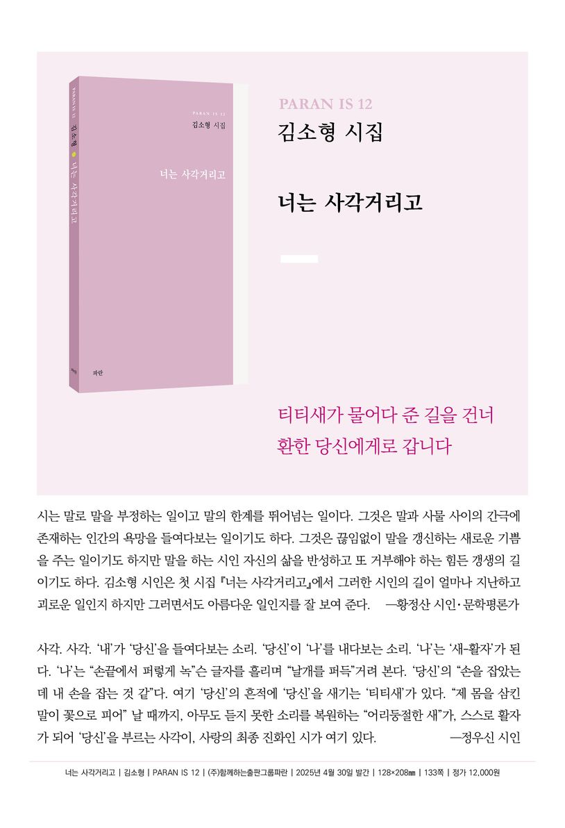 [너는 사각거리고]는 김소형 시인의 첫 번째 신작 시집으로, 「그냥」 「새파란 눈」 「머나먼 나무」 등 57편이 실려 있다. 김소형 시인은 전라북도 전주에서 태어났고, 2021년 [애지]를 통해 시인으로 등단했다. 시집 [너는 사각거리고]를 썼다.
