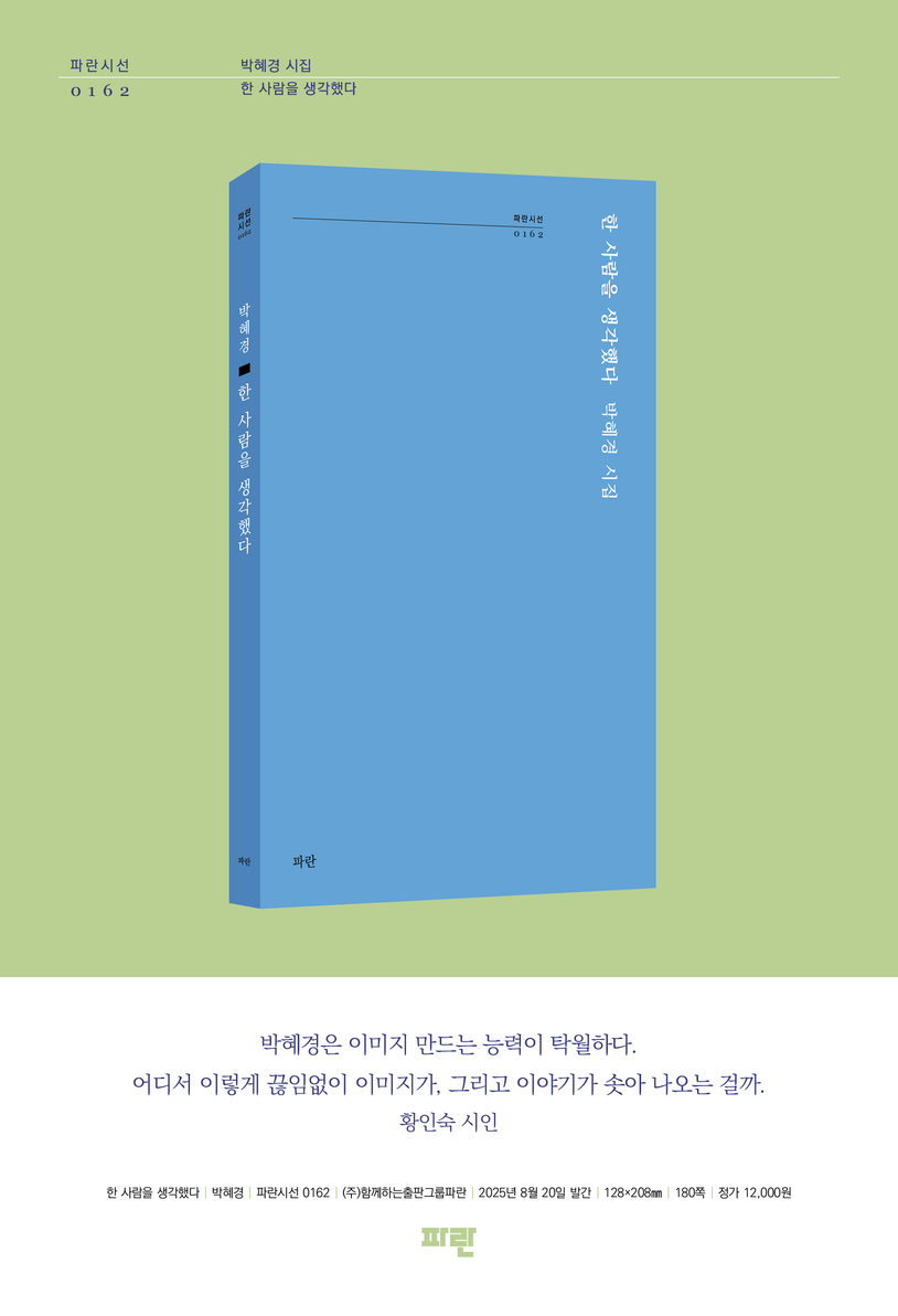 [한 사람을 생각했다]는 박혜경 시인의 첫 번째 신작 시집으로, 「너의 생일」 「감은 네 눈동자 속으로」 「선향의 모자」 등 50편이 실려 있다. 박혜경은 2015년 [작가세계]를 통해 시인으로, 1987년 [동아일보] 신춘문예를 통해 문학평론가로 등단했다. 시집 [한 사람을 생각했다], 비평집 [상처와 응시] [오르페우스의 시선으로], 인문학에세이집 [당신의 차이를 즐겨라] 등을 썼다.