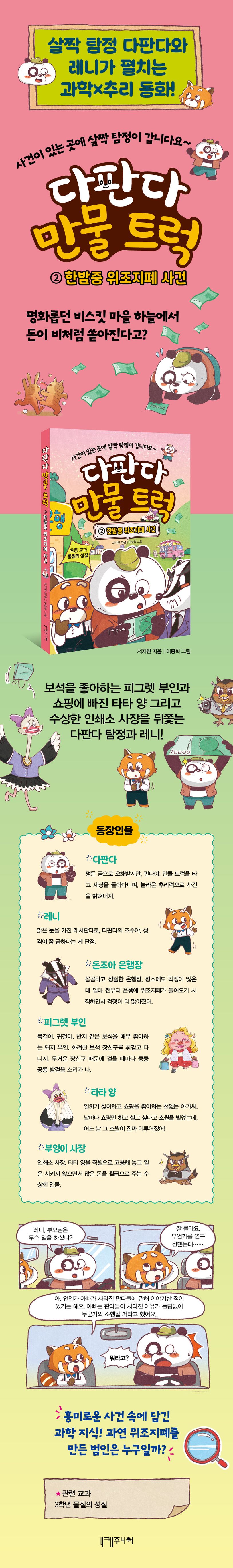 《다판다 만물 트럭》은 흥미진진한 사건을 풀어나가면서 과학 지식을 익힐 수 있는 추리×과학 동화예요. 2권은 평화로워 보이는 비스킷 마을에서 벌어진 위조지폐 사건이랍니다.