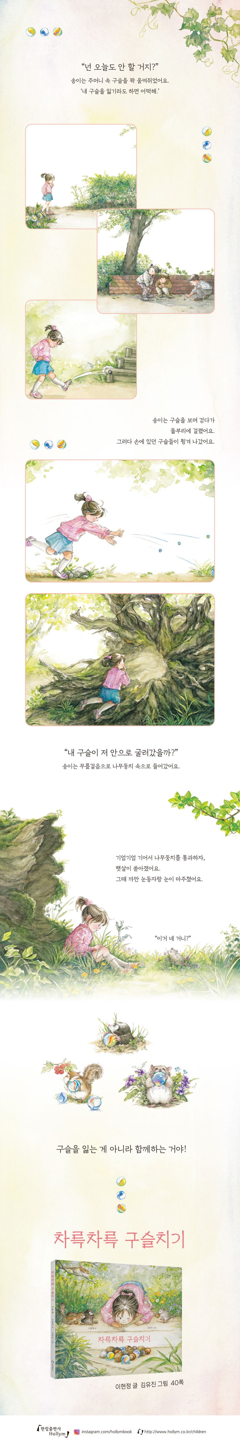 『차륵차륵 구슬치기』는 구슬을 아끼는 아이와 숲속 친구들이 펼치는 유쾌하고 감동적인 하루의 여정을 그린다. 작은 구슬을 통해 함께하는 의미를 배우며 우정을 나누고 성장하는 아이의 아름다운 순간이 따뜻하게 느껴지는 그림책이다.