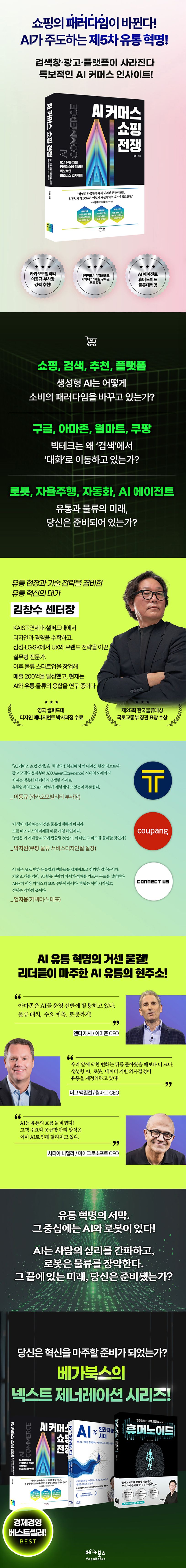 쇼핑전쟁의최전선에서유통의새로운패러다임을파헤치다!검색창,광고,플랫폼도사라질AINew커머스시대쇼핑을새롭게정의하는기업은어떤무기로혁신을꿈꾸는가?“이책이제시하는비전은물류업계뿐만아니라모든비즈니스의미래를바꿀게임체인저다.”_박지원(쿠팡물류서비스디자인실실장)리서치전문업체마켓앤마켓은전세계AI시장규모를2023년1,502억달러(약200조원)에서2030년1조3,452억달러(약1,800조원)으로9배성장할것으로예측했다.2030년까지글로벌AI시장이연평균무려36.8%성장하는것이다.2025~2028년은생성형,연합학습,설명가능,엣지AI의고도화가이루어지고2028~2030년은인간수준의정교한생성형AI가등장해광범위한연합학습을채택하고전산업분야에설명가능한AI가도입되고자율적,실시간인텔리전스가가능한고급엣지AI가보편화될것으로예상했다.“AI기술은온라인쇼핑의근본적변화를가져올것이다”대기업에서의기술개발과물류스타트업운영경험을가진저자의예리한예측과분석아마존,월마트,구글은생성형AI를활용해쇼핑경험을혁신중이며유통물류산업에거대한변화를가져오고있다.세기업의전략은다르지만메시지는하나다.생성형AI가열어갈새로운쇼핑시대가개막되었다는것이다.20년이상디자인,사용자경험,브랜드전략분야에서일했고특히물류스타트업을직접운영하며라스트마일딜리버리의현실적문제들을몸소경험한저자는이과정에서AI와자율주행,로봇기술이가져올혁명적변화에주목하고있다.AI기술이온라인쇼핑의근본적인변화를가져올것이라는저자의분석이매우흥미롭다.대기업에서의기술개발과스타트업창업가로서의현장경험이융합된저자는국내외빅테크기업들의AI커머스전략과물류자동화기술의현재와미래를예리하게그려내고있다.입고먹고보고듣고신고만져보는오감체험을온라인에서!혁명적으로바뀌는소비자쇼핑환경과경험심상치않은구글의행보기존검색광고업에서유튜브를통한쇼핑서비스업체로변신?구글은생성형AI를활용한새로운쇼핑서비스들을잇달아선보이고있다.‘상전벽해’의느낌이다.구글과쇼핑이라니.뭔가미스매칭같다.하지만내막을들여다보면자연스러운행보다.구글은단순히새로운쇼핑몰을만드는것이아니라온라인쇼핑의근본적인문제들을해결하고실제매장에서의쇼핑경험을온라인으로옮겨오겠다는야심찬목표를세웠다.고객이오프라인매장에서점원과대화하며물건을고르고옷을직접입어보고화장품을얼굴에발라보고신발을신어보는이모든느낌을AI의도움으로더똑똑하고더개인화된방식으로온라인에서구현하겠다는것이다.와우!시공을초월하는정말놀라운혁신적인시도가아닐수없다.인력확보의어려움과비용증가를고민하는물류·유통산업그솔루션은바로휴머노이드로봇이책모든장의내용이나름알차고유익하지만특히눈길을끈것은생활밀착형로봇활용이었다.지금전세계는물류센터작업자와배송인력확보가갈수록어려워지고인건비와물류비용도계속증가추세인데이러한문제의해결사가바로휴머노이드로봇이다.일선산업현장에게는가뭄의단비일것이다.생성형AI의발전으로로봇이사람처럼걷고물건을집어옮기고포장하고물류센터에서24시간쉬지않고상품을분류하고고객의집앞까지직접배달하는로봇시대가눈앞에다가온것이다.