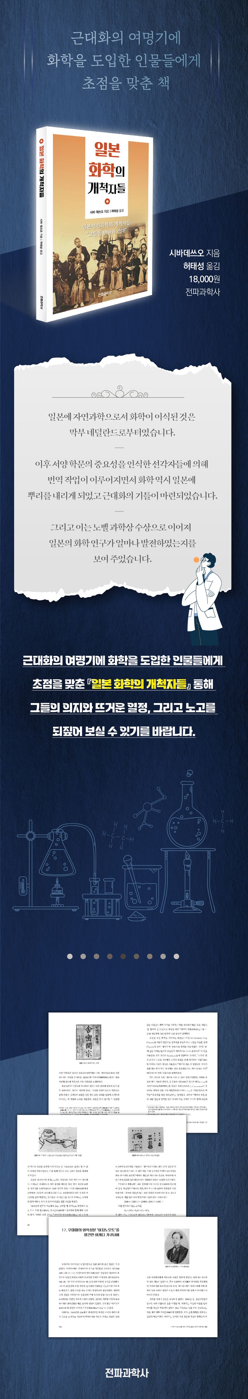 막부 말기부터 근대에 걸쳐 일본에는 네덜란드를 위시로 서양으로부터 화학이 도입되었다. 『일본 화학의 개척자들』은 바로 이 여명기를 다룬 책으로써, 당시 서양에서 화학을 도입한 여러 인물들에 초점을 맞추어 선각자들의 높은 의지와 뜨거운 열정, 그리고 노고를 되짚는다. 이는 또한 단순한 과학사 그 이상으로 일본 근대사의 일단을 보여주고 있다.