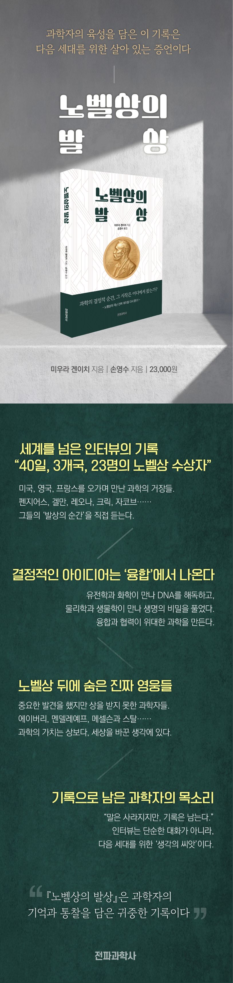 『노벨상의 발상』은 과학자의 육성을 기록한 시대의 증언이자, 과학의 진정한 가치와 의미를 다시 묻는 책이다. 이는 다음 세대를 향한 소중한 지적 유산으로 남을 것이다.