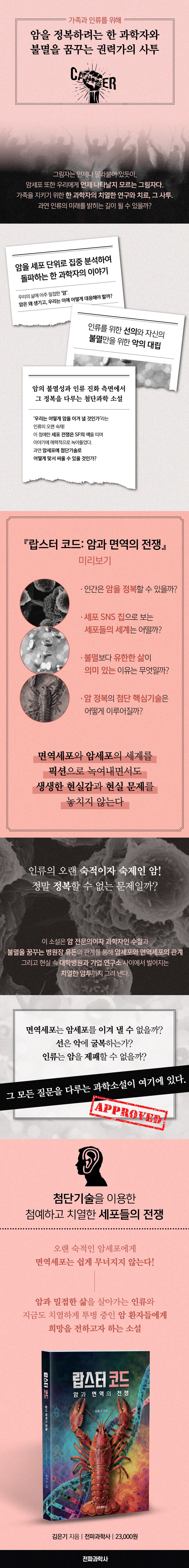 책속에서랍스터:책의제목인랍스터는실제로장수하는생물이다.장수비결은랍스터몸속줄기세포가활발하고세포가나이들어도늙지않는다는데있다.소설속그룹비밀연구소에서는이랍스터의‘불멸’유전자를사람에게주사하여‘불멸신약’을만들려한다.실제로이런연구는동물대상으로시도되었다.---「1막1장」중에서SNS칩:몸속세포들은‘소통물질’을만들어서로소통한다.외부침입자를알려주고협공으로죽인다.이들소통물질은수백종류다.이들의‘대화’를해석하는연구는건강상태측정에중요하며현재개발중이다.AI의도움으로이들대화를듣는‘SNS칩’을만든주인공의사는면역세포들이야기속에암치료힌트가있을거로생각한다.---「1막3장」중에서면역상황실:면역세포는전투병이다.이들은지휘체계가있는군대조직과유사하다.상황실에서는세균,바이러스등이침입하면체계적으로대응한다.바로전쟁이다.코로나당시사이토카인폭풍으로심각한위험이닥쳤다.왜그런일이생기는지,어떻게대응하는지를소설속장면으로볼수있다.---「2막8장」중에서암불멸설:암은지구상동물과함께태어났고사라지지않았다.지금도우리몸에서자라고있다.암은왜진화경쟁에서사라지지않았을까?무엇이이들암세포를불멸로만들었을까.소설속면역사관학교교장은암불멸설을본인이야기로전한다.‘내가나이들면교수직을내놓고빨리사라져야너희가좋을거아냐?’나이든개체는개체번식에도움이안된다.사라지는게번식을돕는길이다.사라지게만드는그게암이다.이게맞는이야기일까?---「3막13장」중에서암의천적:암의천적은화학항암제일까?표적항암제일까?아니다.암은이들과계속싸움을하면,조금씩진화한다.그래서항암제에내성이생긴다.소설속에서면역상황실의킬러팀장은이런점을동료면역세포들에게이야기하며그들의용기를북돋운다.‘우리가암의천적이야,우리만이암을정복할수있어,자,나가자,나가서암을쳐부수자!’---「3막15장」중에서난공불락암동굴:암대부분은‘고형암’,즉덩어리이다.이덩어리내부에있는암세포들은항암제공격에저항한다.항암제도잘침투되지않는다.면역세포들도이동굴에들어가기힘들다.낮은산소,독성물질들로차있다.이곳을제대로공격해야암세포를죽일수있다.소설에서는이곳암동굴전투에서고전하는면역세포들과이를안타까지지켜보는주인공의사와여자연구원의한숨소리를들을수있다.---「3막16장」중에서교활한암세포:암세포가자기를공격하는면역세포의브레이크페달을밟는다.그러면면역세포무릎이꺾인다.이를SNS칩을통해바라보던주인공은절망한다.그정도는약과다.암세포가내뿜는‘유혹’물질로근처에있던면역세포가좀비상태가된다.이들이면역세포를약하게만들고공격한다.---「3막17장」중에서암의기원과정복가능성:주인공은‘암은불패’라는트라우마를가지고있다.그걸극복하고악당의계략으로뇌종양에걸린딸을살리기위해본인이죽음문턱까지스스로내려간다.개체가정자,난자형태로번식하지못하는죽음의상태가되면개체는번식최후수단을쓴다.바로태초의박테리아처럼이분법으로분열하도록변화한다.그것이암이라는학설이다.주인공은죽음직전에켜지는유전자가암의‘마스터스위치’이고이걸찾아내려한다.---「4막20장」중에서불멸의방정식:불멸을누리려는악당병원장은본인이암에걸리지않고불멸을이루려고주인공딸과부인에게‘불멸’유전자를주입한다.이과정에서암세포,줄기세포의공통점을발견하고그것이현재실험실에서사용중인불멸의‘헬라세포’와같음을알아낸다.불멸의열쇠이다.---「4막21장」중에서베테랑세포:암동굴에들어가서전투하고살아남은‘베테랑’면역세포는암을가장잘공격할수있다.소설속킬러팀장은마지막순간까지암줄기세포와한판대결을벌인다.모든희망이사라진순간에수백만베테랑세포들이나타난다.암동굴을때려부순다.현재임상단계에와있는‘종양침투림프구’개인맞춤형암치료제이야기다.---「4막22장」중에서