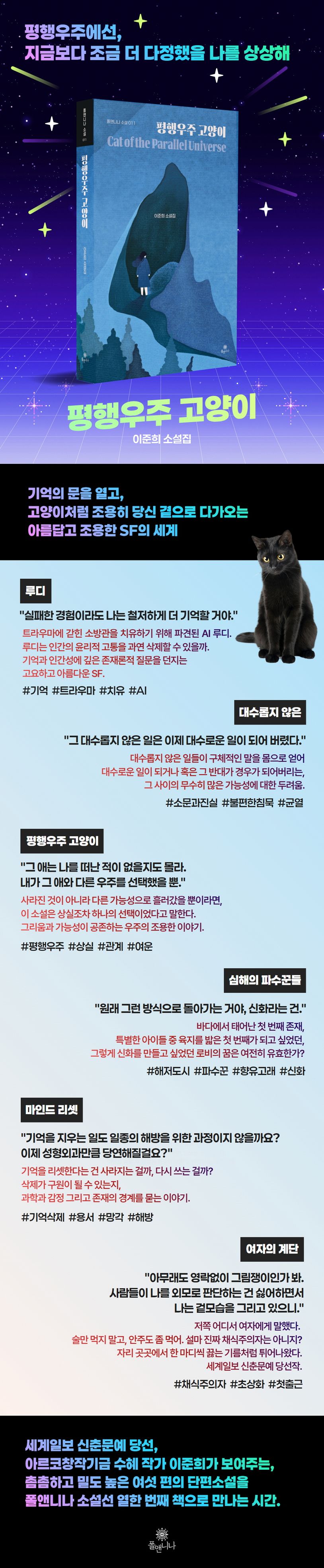 기억을 지우는 시술을 받으려는 사람들이 있다. 시간을 조작하는 비밀스러운 기술을 가진 자들과 고통스러운 기억을 가진 자들은 미세하게 충돌한다. 기억을 삭제해도 알 수 없는 죄책감이 남았고, 오히려 근원 없는 죄책감에 더욱 고통스러운 자들이 존재한다(「마인드 리셋」). 소방관의 PTSD를 치료하기 위해 파견된 로봇 루디는 혼수상태에 빠진 소방관의 기억에 새로운 스토리텔링을 삽입해 기억을 조작함으로써 그를 구하려 하지만, 그는 말한다. 실패한 경험이라도 철저하게 더 기억할 것이라고. 그렇다면 루디는 그를 구하지 못한 것인가(「루디」). 우리가 사는 세계가 단 하나가 아닐지도 모른다는, 그러니 지금의 이별에 연연하지 말라는 듯 홀홀 이 세계를 떠난 레나를 기어이 기억하고야 마는 주인공도 있다(「평행우주 고양이」). 무언가를 잊는다는 것, 다시 기억한다는 것, 누군가를 기다리고 지킨다는 것. 그 감정은 시대가 바뀌어도 유효하다. 존재와 기억, 윤리와 기술의 경계에서 출렁이는 세계를 다룬 여섯 편의 소설이다.