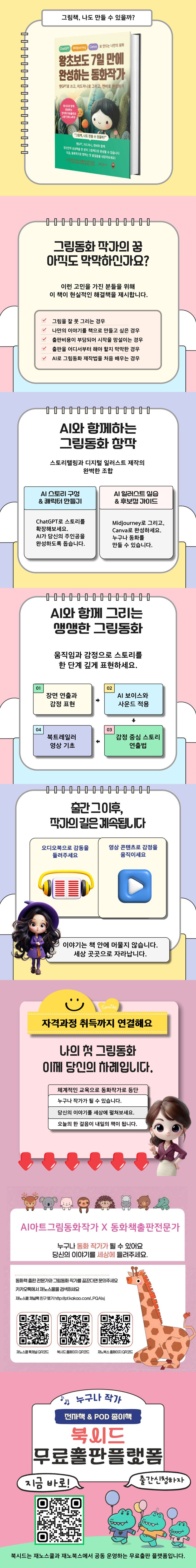 더 이상 망설일 이유가 없습니다! 대형 출판사의 승인도, 거액의 제작비도, 특별한 재능도 필요 없습니다. 오직 7일간의 집중력과 이 책만 있으면 됩니다. 지금 시작하세요! 여러분의 동화가 세상을 기다리고 있습니다.