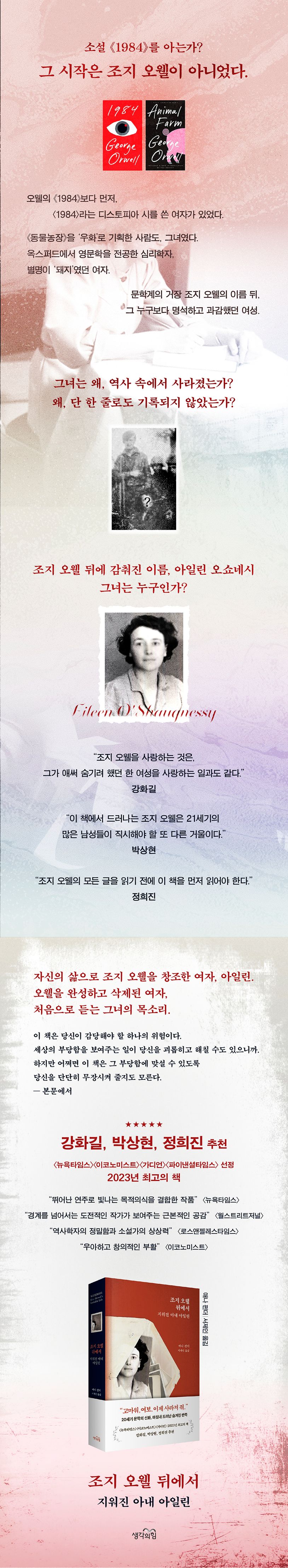 여러증언과기록속의아일린은작가지망생‘에릭블레어’가대작가‘조지오웰’이될수있도록그를경제적으로부양하고,심리적으로지지하고,지적으로교류하며,창작을뒷받침하는존재였다.저자는조지오웰의팬이었던자신이아일린의헌신을알지못했다는사실에,아일린이의도적으로지워진‘보이지않는존재’였다는사실에끊임없이놀란다.왜우리는아일린을알지못했을까?아일린의이름을지운것은누구일까?
