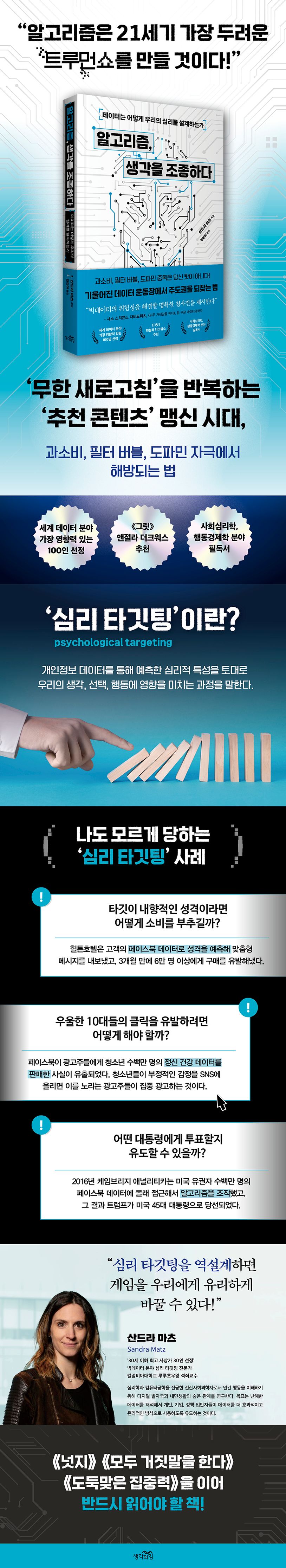 1부는 검색 기록, ‘좋아요’, 시청 목록 같은 행동 잔여물을 모아서 익명의 개인을 구체적으로 프로파일링하는 딥러닝에 대해 알아본다. 이런 몽타주로 성격부터 성적 취향, 정신 건강 등을 모두 예측할 수 있다. 2부는 이렇게 생성된 프로필로 심리 타깃팅할 때의 빛과 그림자를 모두 보여준다. 정부와 기업은 개인의 디지털 발자국을 추적해 생각, 감정, 행동을 통제하기도 하지만, 우리 역시 저축을 늘리거나 우울증을 치료하고 민주주의를 확산하는 무기로 사용할 수 있다. 3부는 정부와 기업, 시민 모두 이익을 얻는 전략을 알아본다. 오늘도 ‘무한 새로고침’만 반복하고 시간을 낭비했는가? 알고리즘에 끌려다니지 않고 주도적으로 인생을 살아가고 싶은 이들에게 《알고리즘, 생각을 조종하다》가 최고의 해결책이 되어줄 것이다.