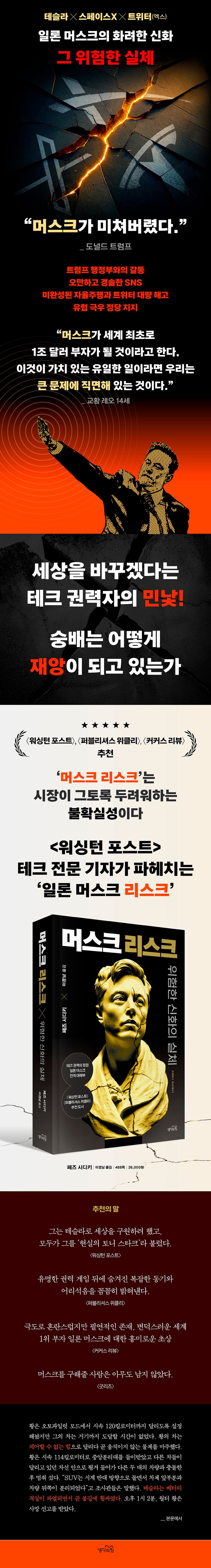 테슬라와삼성의계약,하이닉스와삼성전자를위시한반도체주의코스피3400견인,테슬라의자사주매입(10억달러),일론머스크에대한테슬라이사회의1조달러규모성과급패키지제안등투자자라면주목해야할이슈가가득한때다.한국개인투자자들의TSLA(테슬라주식)보유규모는34조이며TSLL(테슬라2배ETF)의경우한국인투자비중이42%에이른다.《머스크리스크》는첨예한국제정세속에서머스크의사업적행보의의미를심도있게분석한다.머스크의선택은미국의기술패권주의,관세정책,그리고글로벌공급망의변화와밀접하게연결되어있어중요하다.“그가앞으로어떤행보를보일지짐작할수있는가장좋은방법은지금까지그가자신의권력을어떤식으로휘둘렀는지살펴보는것이다.”(10쪽,출간에부쳐)