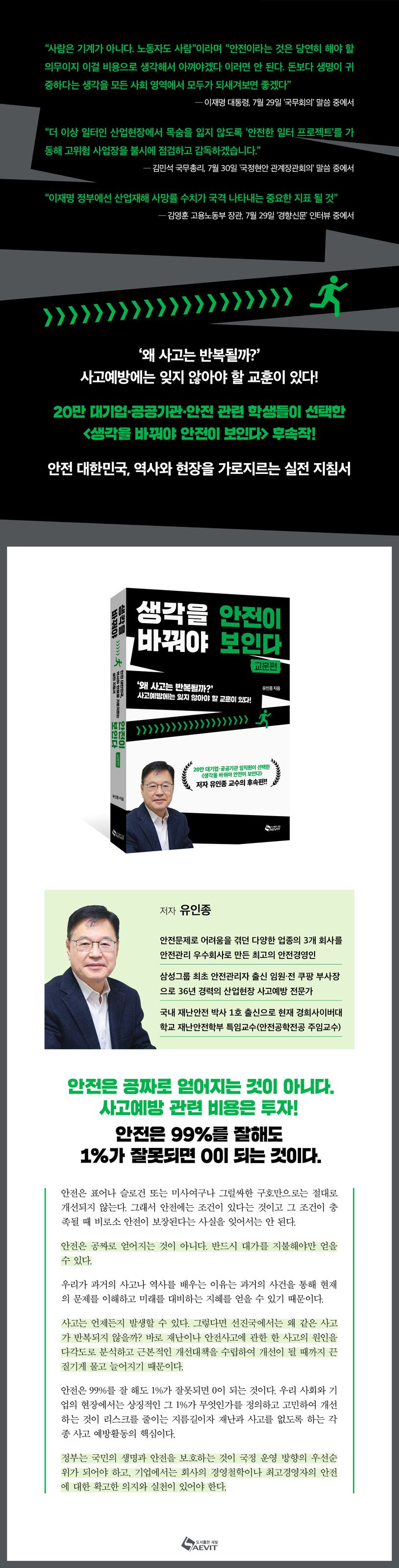 국내재난안전박사1호,삼성그룹최초안전관리자출신임원유인종교수의메시지에주목하라새정부가출범한이후,이재명대통령은기업방문과국무회의등에서산업재해예방대책에관하여계속하여강한메시지를내고있다.OECD10위안의국가가산업재해사망률1위라는오명을벗고노동자들의’일하다가죽지않을권리‘를위해정부와기업의역할을강조하고자하는대통령의강한의지를엿볼수있다.이런상황에서저자유인종교수가삼성에서지난33년간직장생활을하면서사고예방을위해그동안했던노력과우리기업이나사회가사고예방을위해해야할일들에대한느낌과생각을정리한‘생각을바꿔야안전이보인다’를출간한지5년이란세월이지났다.저자는그동안삼성을떠나안전문제로크게이슈가되었던쿠팡에합류하여새로운문화와환경에서처음부터안전을다시시작하는마음으로사고예방관리체계를확립하고안정화시켰다.쿠팡에서의경험은우리나라산업현장의안전관리현황과실상,그리고경영자및관리감독자와안전관리자들의의식과수준을직·간접적으로알게되는계기도되었다.삼성에서만근무했었다면알수없었던안전에또다른눈을뜨게했던귀한경험이었다.저자는안전공학을전공하고안전관리자로첫직장생활을시작한이래36년간삼성그룹과쿠팡에서중화학,건설,서비스및물류등의다양한분야의산업현장에서안전문제로어려움을겪던사업장과회사를반석위에올려놓은현장의사고예방전문가이다.이러한공로를인정받아삼성그룹에서는“자랑스런삼성인상”,정부로부터는산재예방유공산업포장을수상하기도했던국내최고의안전관리자이다.이책은우리사회에서과거에발생했던사고와똑같은사고가끊임없이반복되는사회적참사를되풀이하지않도록하는데도움을주기위해교훈이되는사고의발생과원인을연대기별로정리하고교훈과시사점을저술했다.또한안전과관련되는고사성어를해석하고사고예방을위해해야할일들과방법을제시하고있다.안전은표어나슬로건또는미사여구나그럴싸한구호만으로는절대로개선되지않는다.그래서안전에는조건이있다는것이고그조건이충족될때비로소안전이보장된다는사실을잊어서는안된다.안전은공짜로얻어지는것이아니다.반드시대가를지불해야만얻을수있다.우리가과거의사고나역사를배우는이유는과거의사건을통해현재의문제를이해하고미래를대비하는지혜를얻을수있기때문이다.각종사고와재난으로인한소중한인명과재산손실이실로막대하고,나와사랑하는내가족이그대상이되지않으리라장담할수없는현실에우리모두가살아가고있다.사고가반복되는것은우리사회와기업이거듭되는사고를통해서도아직사고예방의충분한교훈과그에따른해결책을제대로찾지못하고있다는의미이다.사고는언제든지발생할수있다.그렇다면선진국에서는왜같은사고가반복되지않을까?바로재난이나안전사고에관한한사고의원인을다각도로분석하고근본적인개선대책을수립하여개선이될때까지끈질기게물고늘어지기때문이다.안전은99%를잘해도1%가잘못되면0이되는것이다.우리사회와기업의현장에서는상징적인그1%가무엇인가를정의하고고민하여개선하는것이리스크를줄이는지름길이자재난과사고를없도록하는각종사고예방활동의핵심이다.정부는국민의생명과안전을보호하는것이국정운영방향의제1순위가되어야하고,기업에서는회사의경영철학이나최고경영자의안전에대한확고한의지와실천이있어야한다.