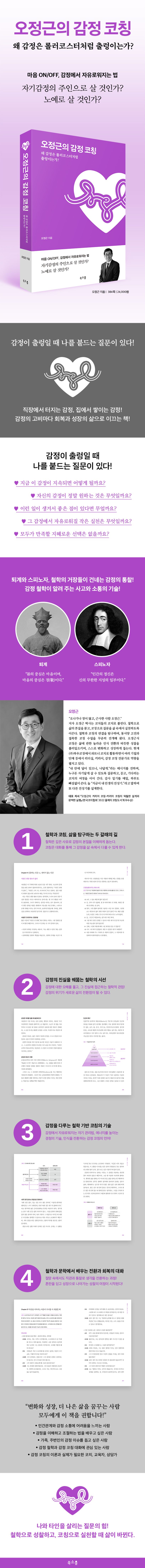 《오정근의커리어코칭:커리어코칭의탁월한설계와완벽한실행》으로‘2022한국코치협회올해의코칭도서’최우수상을받은저자는‘감정’이라는내면의파도위에서성장의항해를시작한다.‘코치들의코치’가전하는이책은,철학과코칭을바탕으로감정을이해하고실천하는방법을안내하는감정사용설명서이자감정코칭입문서이다.감정을이해하면,삶은더깊어지고더너그러워진다.고전속철학자들의지혜가실용적인질문언어로이어질때,감정의회복과삶의전환이가능해진다.이책은그가능성을실현하게돕는다.