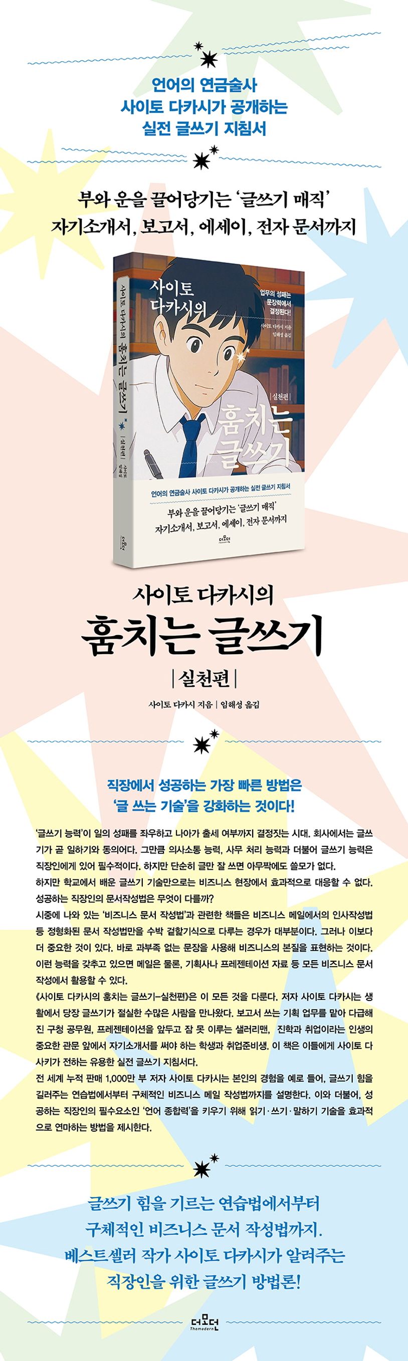 《사이토 다카시의 훔치는 글쓰기-실천편》은 이 모든 것을 다룬다. 저자 사이토 다카시는 생활에서 당장 글쓰기가 절실한 수많은 사람을 만나왔다. 보고서 쓰는 기획 업무를 맡아 다급해진 구청 공무원, 프레젠테이션을 앞두고 잠 못 이루는 샐러리맨, 진학과 취업이라는 인생의 중요한 관문 앞에서 자기소개서를 써야 하는 학생과 취업준비생. 이 책은 이들에게 사이토 다사키가 전하는 유용한 실천 글쓰기 지침서다.