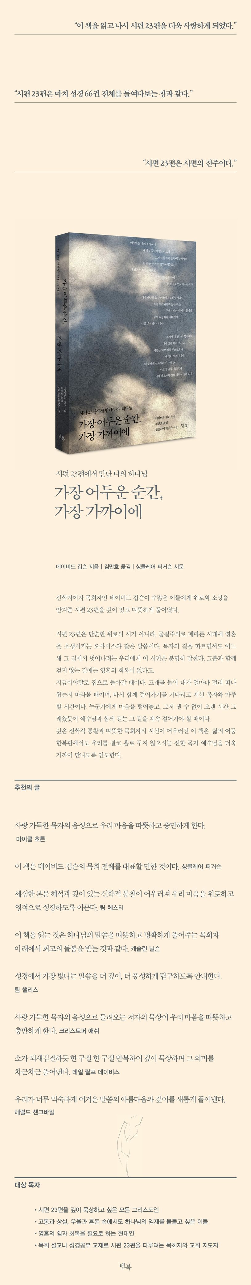 누구나 한 번쯤 암송해 본 성경 구절이자, 수많은 사람들에게 위로와 소망을 안겨준 시편 23편. 이제 이 말씀을 새로운 시각으로 마주하게 될 기회가 찾아왔다. 국내 독자들에게도 익숙한 신학자이자 목회자, 데이비드 깁슨이 시편 23편을 깊이 있고 따뜻하게 풀어낸 것이다.