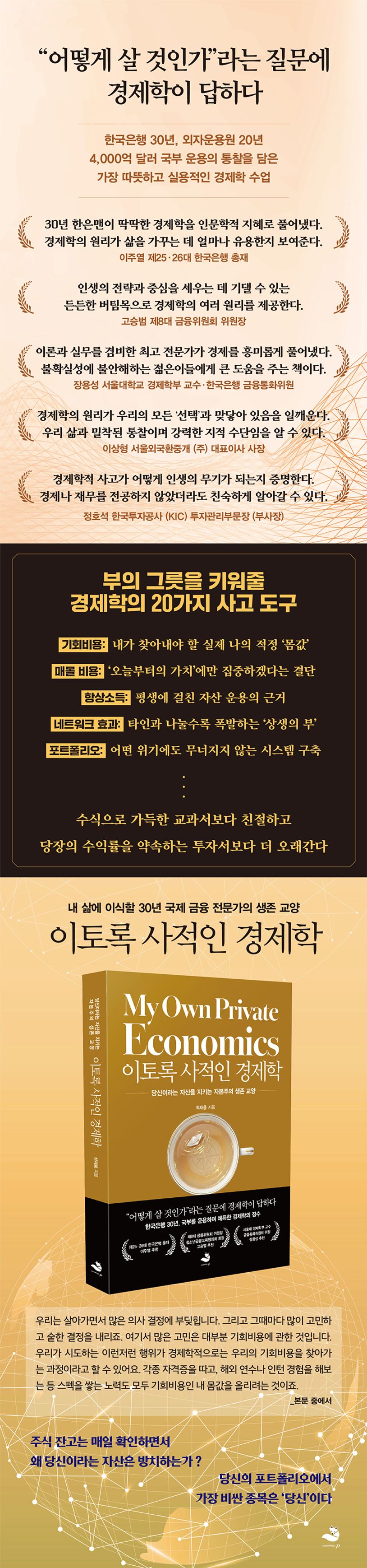 저자에 따르면 국가라는 거대 조직이 불확실한 시장에 대응해 ‘무너지지 않는 시스템’을 구축하듯, 개인의 삶에도 치밀한 전략이 필요하다. 이 책은 복잡한 수식으로 가득한 교과서보다 친절하게 이론을 설명하고, 당장의 수익률을 약속하는 투자서보다 더 오래갈 인생 설계의 전략을 담았다. 사회에 첫발을 내디딘 초년생부터 커리어와 투자의 갈림길에서 방황하는 이들까지, 이 책에서 평생의 무기가 될 든든한 ‘생존 교양’을 얻을 수 있을 것이다.