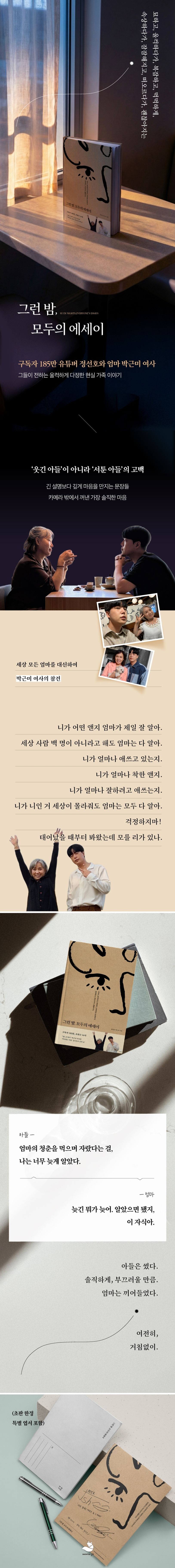 처음정선호라는이름을들었을때,우리는그를‘유튜버’라는프레임으로봤다.구독자185만명,숫자는압도적이었지만그숫자가책으로이어질수있을까.그러나그의글은영상과달랐다.무겁지않았지만솔직했다.화학박사과정을중단한이야기,공황발작을홀로버텨낸시간,엄마환갑을챙기지못한미안함.카메라앞에서는꺼내지못했던것들이글안에있었다.화학자특유의시선으로인간관계를풀어내는방식은낯설면서도정확했다.위로하려들지않고툭던지는그의이야기와엄마의잔소리가만들어내는앙상블은이책을끝까지읽게만드는힘이됐다.편집과정에서가장신경쓴것은이책이정선호의팬을위한책이되어서는안된다는것이었다.부모와사이가좋은사람도,그렇지않은사람도.가족이라는단어가따뜻한사람도,그렇지않은사람도.누구도이책앞에서소외되지않도록.실제로박근미여사는세상의모든엄마를대변하듯불쑥참견을이어간다.“친구잃었다고너무슬퍼하지마.지금네옆에남아있는사람,그사람이진짜야.”“미련은상대한테남는게아니야.최선을다하지못한나한테남는거야.”뻔한말처럼들릴수도있는이말들은아들정선호의글과함께읽을때묘할정도로심장을건드린다.“오늘하루별일없이지나가면그게성공이야.밥맛있게먹고,잠푹자고,내일또눈뜨면성공한거지.”그녀의한마디한마디에서내부모,내엄마가떠오르는말할수없는찡한순간들.그한번의순간이이책이노린바로그것이적중한순간이된다.아들은솔직하게부끄러울만큼.엄마는거침없이끼어든이글들이누군가의책장한편에꽂혀어느날펼쳐지기를바란다.