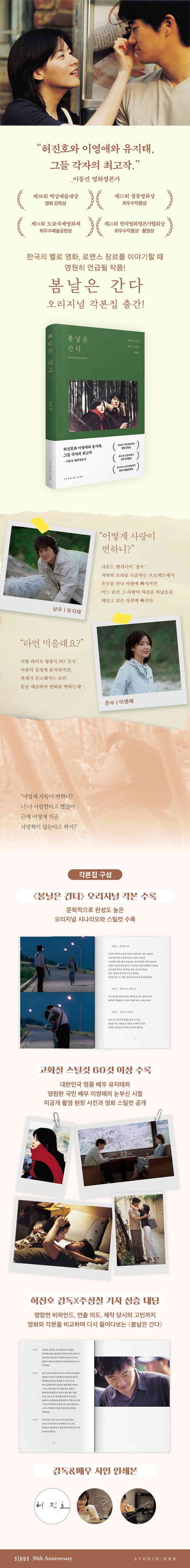 은수와 상우가 처음 만나는 터미널 대합실 장면부터 “라면 먹을래요?”와 “사랑이 어떻게 변하니”라는 대사로 대표되는 만남과 헤어짐의 순간, 그리고 배우들이 그때그때의 감정에 따라 감독과 함께 만들어간 무수한 장면들은, 지금껏 우리가 알고 있던 〈봄날은 간다〉를 전혀 다른 방식으로 이해하고 해석할 수 있는 자리를 마련해 준다. 말하자면 각본집과 완성된 영화를 비교해 보는 과정만으로도 완전히 새로운 시선을 얻게 되는 것.