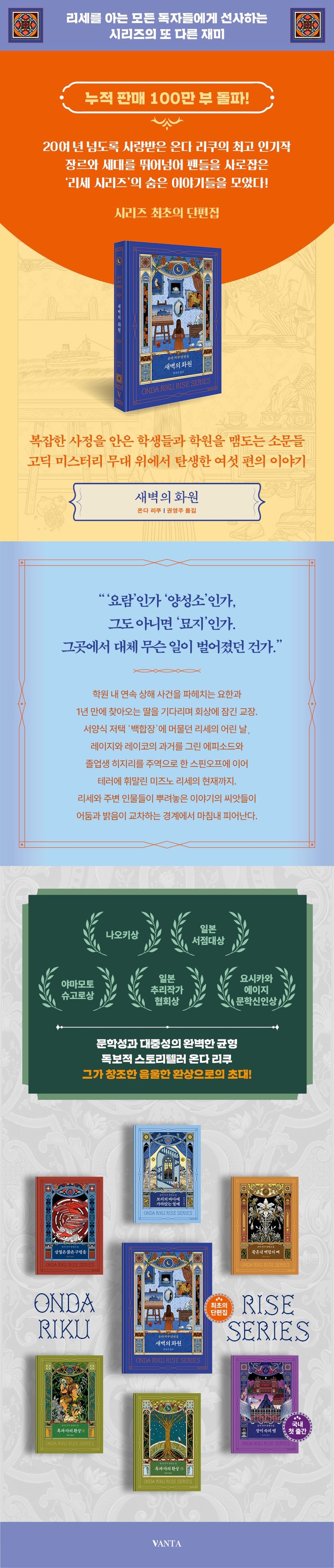 아름답고불길한습원위의기숙학교고딕미스터리무대위에서탄생한여섯편의이야기습원한가운데,아는사람만아는기숙사제사립학교가있다.학생들은개개인의상황에따라과보호를위한‘요람’,특수훈련이필요한‘양성소’,그리고영영나오지않길바라는‘묘지’그룹에속하게된다.과연그곳에서는무슨일이벌어지고있는걸까.〈수정의밤,비취의아침〉은동요를모티프로한연속상해사건을그린미스터리로,학생들사이에서종이인형을이용한장난이유행하며기묘한분위기를조성한다.리세와깊은인연으로묶인요한이주인공으로등장해사건해결에나선다.〈보리의바다에뜬우리〉에서는교장의과거를조명하는데,‘독(毒)’을둘러싼에피소드를통해학교를떠도는불길한소문에불을지핀다.〈월식〉은달이사라지는어느밤,졸업생히지리의회상으로이야기가시작된다.리세가학교를떠나고얼마지나지않아새로운수학교사가나타나고,히지리는그에게서알수없는위화감을느낀다.이처럼‘리세시리즈’에등장하는학생들주변에는언제나불길한징조가맴돈다.《새벽의화원》은본편들과마찬가지로가혹하게성장하는아이들의모습에서시리즈특유의위태로운매력을이어가며,독자들을또한번고딕미스터리의세계에빠져들게한다.미처다보여주지못한이야기의확장감춰진단서를발견하는순간의쾌감《새벽의화원》에실린스핀오프작의매력은본편에서다보여주지못한세계와인물의깊이를새롭게탐험할수있다는점이다.익숙한세계관속에서전혀다른시선이나인물의이야기를따라가다보면본편을더풍부하게즐길수있다.〈언덕을가는배〉는현시점에서‘리세시리즈’의가장최신작으로,《보리의바다에가라앉는열매》에등장한레이지와레이코의과거를담았다.여자인레이코가남자로자랄수밖에없었던이유와레이지가레이코를챙겨주게된계기등이그려지며마치비어있던퍼즐조각하나가채워진듯한느낌이들것이다.특히시리즈팬들을대상으로어떤캐릭터의스핀오프를보고싶은지앙케트를실시하여써내려간이야기라는점에서팬들에게는더욱특별할수밖에없다.〈수련〉은《황혼녘백합의뼈》에서“어릴땐리세너도여기서살았잖아?”라고언급된,초등학생리세가‘백합장’에머물던때의이야기다.실제로는《황혼녘백합의뼈》보다먼저쓰였으며사촌형제와타루에대한리세의감정등시리즈의몇몇요소가이안에서예고된다.마지막으로〈그림없는그림책〉은《장미속의뱀》이출간되기전발표된단편으로앨리스와의첫만남을엿볼수있다.성인이된리세가외국호텔에서테러사건에휘말리는데,《장미속의뱀》과같이첩보물느낌이강한데다《황혼녘백합의뼈》와연결되는지점이있어‘리세시리즈’의팬이라면결코놓쳐선안된다.