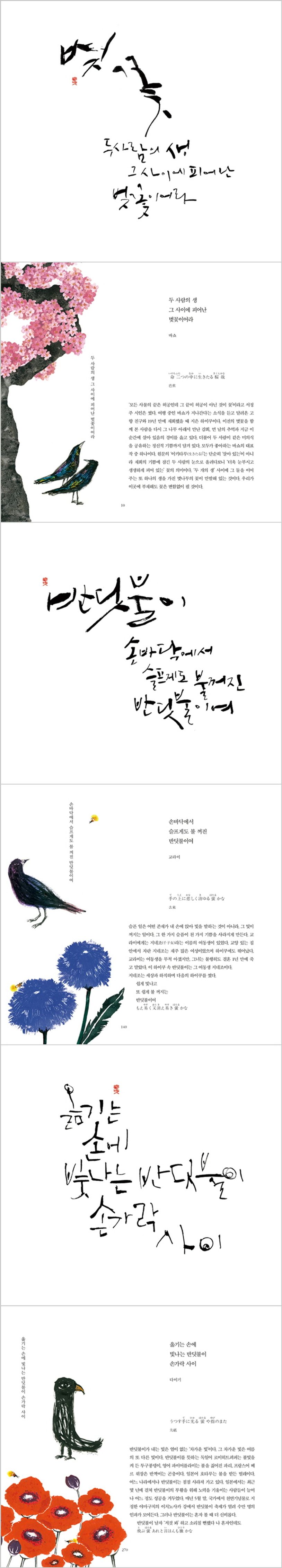 책에는 750쪽에 달하는 방대한 분량으로, 에도 시대의 바쇼, 부손, 잇사, 시키뿐 아니라 현대의 다코쓰, 만타로, 구사타오 등 130명의 시인들의 주옥같은 하이쿠 1,370여 편이 실려 있다. 또한 책 뒤의 150쪽에 이르는 해설 '언어의 정원에서 읽는 한 줄의 시'는 하이쿠의 역사와 배경뿐 아니라 서양의 하이쿠 시인들에 대한 소개까지 담아 하이쿠의 세계를 깊이 이해할 수 있다. 과거와 현대의 하이쿠가 집대성되고 진지한 해설이 곁들여진 이 책은 우리나라 뿐 아니라 일본이나 서양에서도 귀한 자료가 되어줄 것이다. 특히 캘리그라퍼 강병인이 쓴 하이쿠 캘리 다섯 점이 특별 제본으로 담겨 있다.
