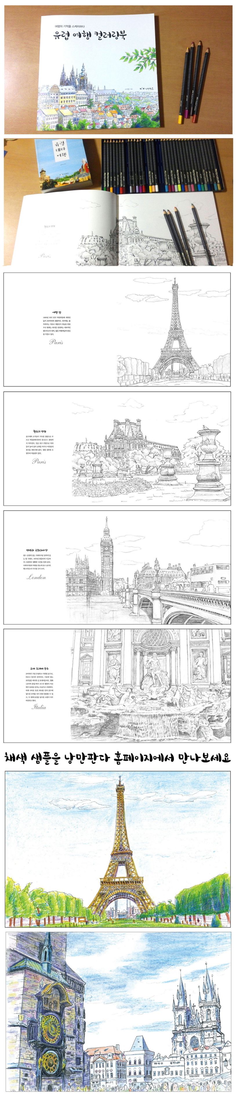 유럽 여행지에서 만난 아름다운 장소와 기억하고 싶은 것들을 직접 손으로 그려 보세요. 연필 스케치 위에 좀 더 디테일한 스케치를 더하거나 색을 칠하면서 여행의 기억을 하나하나 되살려 보세요. 여행의 추억이 손끝에서 되살아나 일상에 아름다운 색깔을 더해 줍니다.