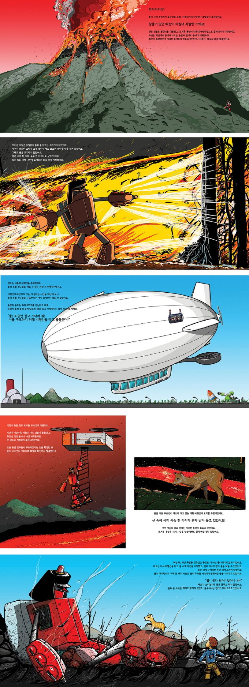 <로봇박사테오>는아이들이늘꿈꿔온박진감넘치는대형로봇을동화책으로옮겨,또래의로봇박사테오와로봇들이전세계를배경으로펼쳐지는다양한이야기를그린국내순수창작그림동화시리즈입니다.아이들의호기심을자극할수있는과학적소재가대형로봇의재미난에피소드로펼쳐집니다.섬세하고아름다운그림은아이와함께읽는부모의눈에도즐거움을주기에충분합니다.첫책<로봇박사테오(2014)>는2014년한국출판문화산업진흥원이주최하는우수출판콘텐츠에선정되었으며,두번째책<장군로봇탄생의비밀(2015)>은도서관저널의추천도서로선정되는등시리즈는호평을이어가고있습니다.<화산이폭발했다!>는<로봇박사테오>에등장한소방수로봇이주인공으로등장하는,시리즈의네번째책입니다.평화로웠던오후,소방수로봇쿨이시커먼연기를내뿜으며폭발하는화산에달려가는것으로시작하는이책은,보는내내아이들이좋아하는대형로봇의박진감과함께화산에서의긴박감을느낄수있도록해줍니다.푸르른산과숲에대조적인시뻘건용암과화염의묘사는책을읽는동안마치화산의뜨거움이전해질것만같습니다.화산폭발로위기에처하는소방수로봇의모습을통해자연의위대함을,동물친구들을구하는소방수로봇과로봇박사테오의모습그리고구해준새끼사슴과의우정을통해자연에대한사랑을함께느낄수있게해주는따뜻한책입니다.*인증유형:공급자적합성확인