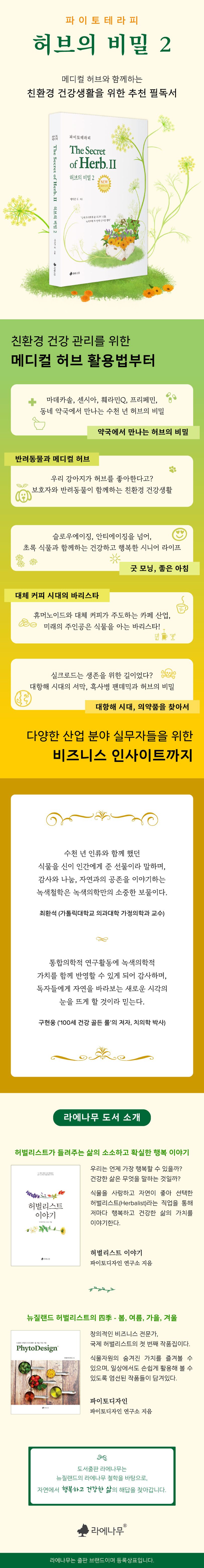 『허브의 비밀 2(The Secret of Herb. II) - 파이토테라피』는 『허브의 비밀 - 녹색의학 이야기』 출간 이후 10년 만에 다시 열리는 두 번째 ‘녹색 선물 상자’입니다. 이 책은 허브를 단순한 식물이 아닌, 자연과 인간을 잇는 다리로 바라보며 그 안에 담긴 철학, 가치, 그리고 실용적 지혜를 차분히 풀어냅니다.