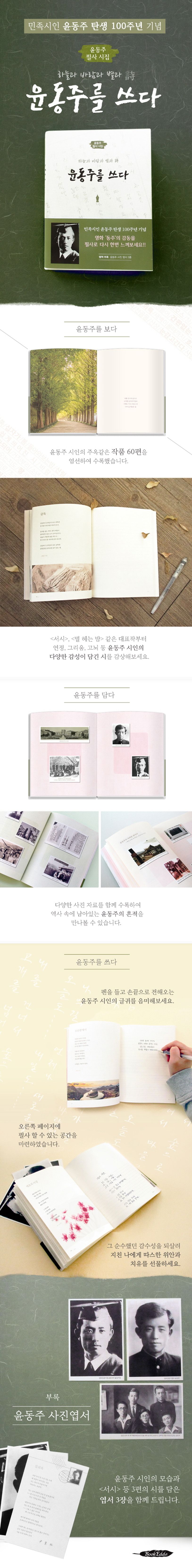 윤동주 탄생 100주년이라는 뜻 깊은 시기를 맞아 [서시], [별 헤는 밤], [참회록], [자화상], [십자가] 등 널리 알려져 있는 윤동주의 대표작뿐만 아니라 시작 활동의 초기인 청소년기부터 독립운동 혐의로 검거되기 전인 1942년까지 쓰인 백 여 편의 시 가운데 그의 시적 감성과 식민지 지식인의 고뇌를 잘 엿볼 수 있는 주옥같은 작품 60편을 엄선해 수록한 윤동주 시선 필사집이다. 윤동주의 시를 천천히 필사하면서 우리의 어린 시절, 그 순수했던 감수성을 되살려본다면, 지치고 상처받은 스스로에게 잊고 있었던 아날로그 감성이 가져다주는 따스한 위안과 치유라는 소박하고도 소중한 선물을 선사할 수 있을 것이다.