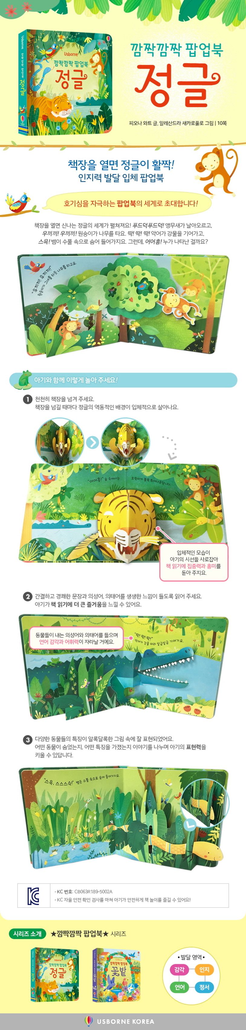 『깜짝깜짝 팝업북: 정글』의 책장을 열면 신나는 정글의 세계가 펼쳐져요! 푸드덕푸드덕! 앵무새가 날아오르고, 우끼끼! 우끼끼! 원숭이가 나무를 타요. 딱! 딱! 딱! 악어가 강물을 기어가고, 스윽! 뱀이 수풀 속으로 숨어 들어가지요. 그런데, 어어흥! 누가 나타난 걸까요?