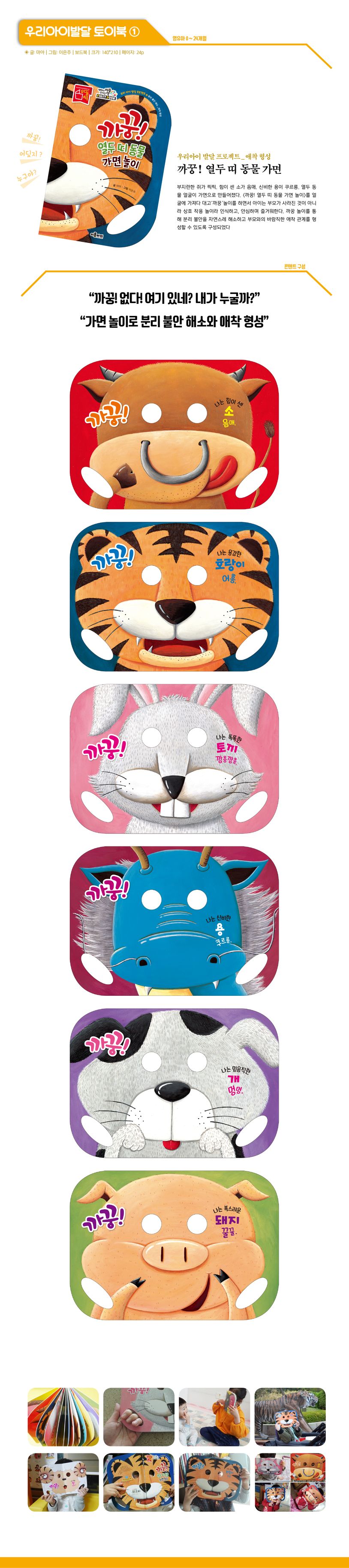 까꿍! 내가 누굴까? 부지런한 쥐가 찍찍. 힘이 센 소가 음매. 동물들의 얼굴이 가면으로 만들어졌어요. 책에 등장하는 동물들의 순서를 보세요. 어딘가 낯익지 않나요? 바로 열두 띠 동물 순서대로 가면들이 등장하는 것이에요. 『까꿍! 열두 띠 동물 가면 놀이』로 부모와 아이가 재미있는 가면 놀이와 까꿍 놀이를 하며 부모와 아이 사이의 바람직한 애착 관계를 형성할 수 있습니다. 나아가 열두 띠 동물들이 누구인지 그리고 그 순서가 어떻게 되는지도 알 수 있어요. 각 장면마다 등장하는 동물들의 울음소리를 의성어로 표현하며 아이의 표현력을 향상시킬 수 있어요.